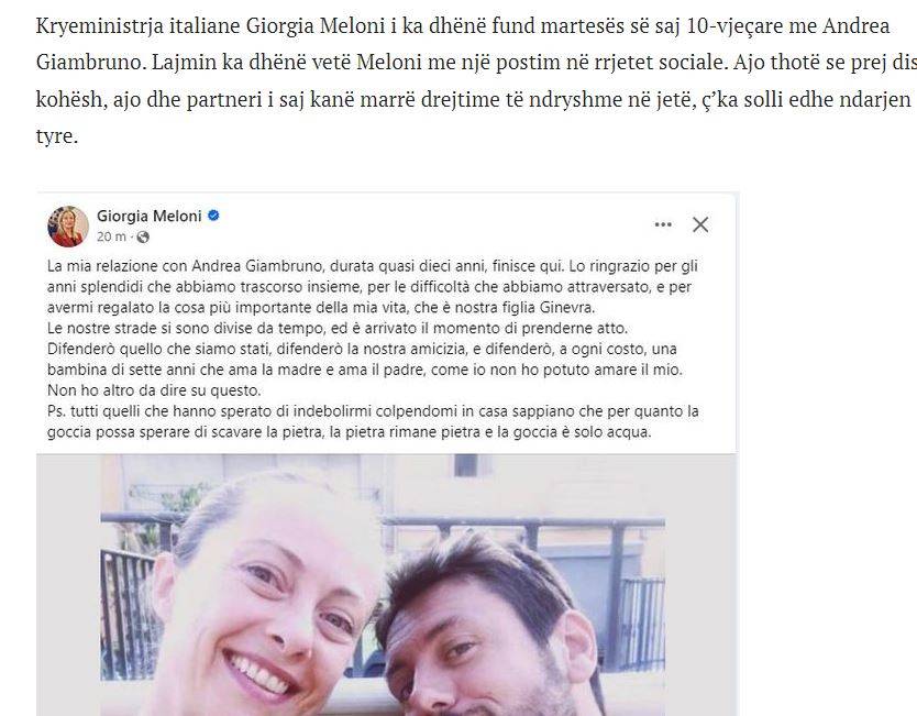 Sot kryeministrja italiane, Giorgia Meloni njoftoi se së shpejti do të nisë procedurat e divorcit me Andrea Giambruno.