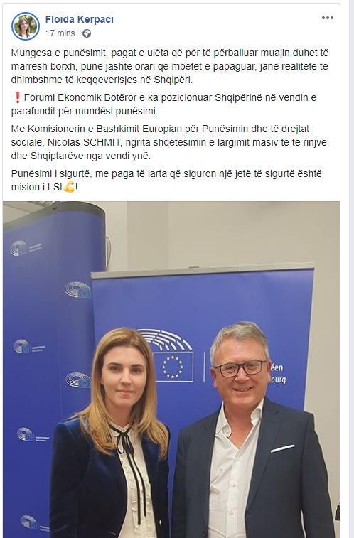 Në një postim në “Facebook”, ish-deputetja Kërpaçi shkruan se mungesa e punësimit, pagat e ulëta dhe punë jashtë orarit që mbetet e papaguar janë realitete të dhimbshme në Shqipëri. Sipas saj, punësimi i sigurt, me paga të larta është mision i LSI-së.