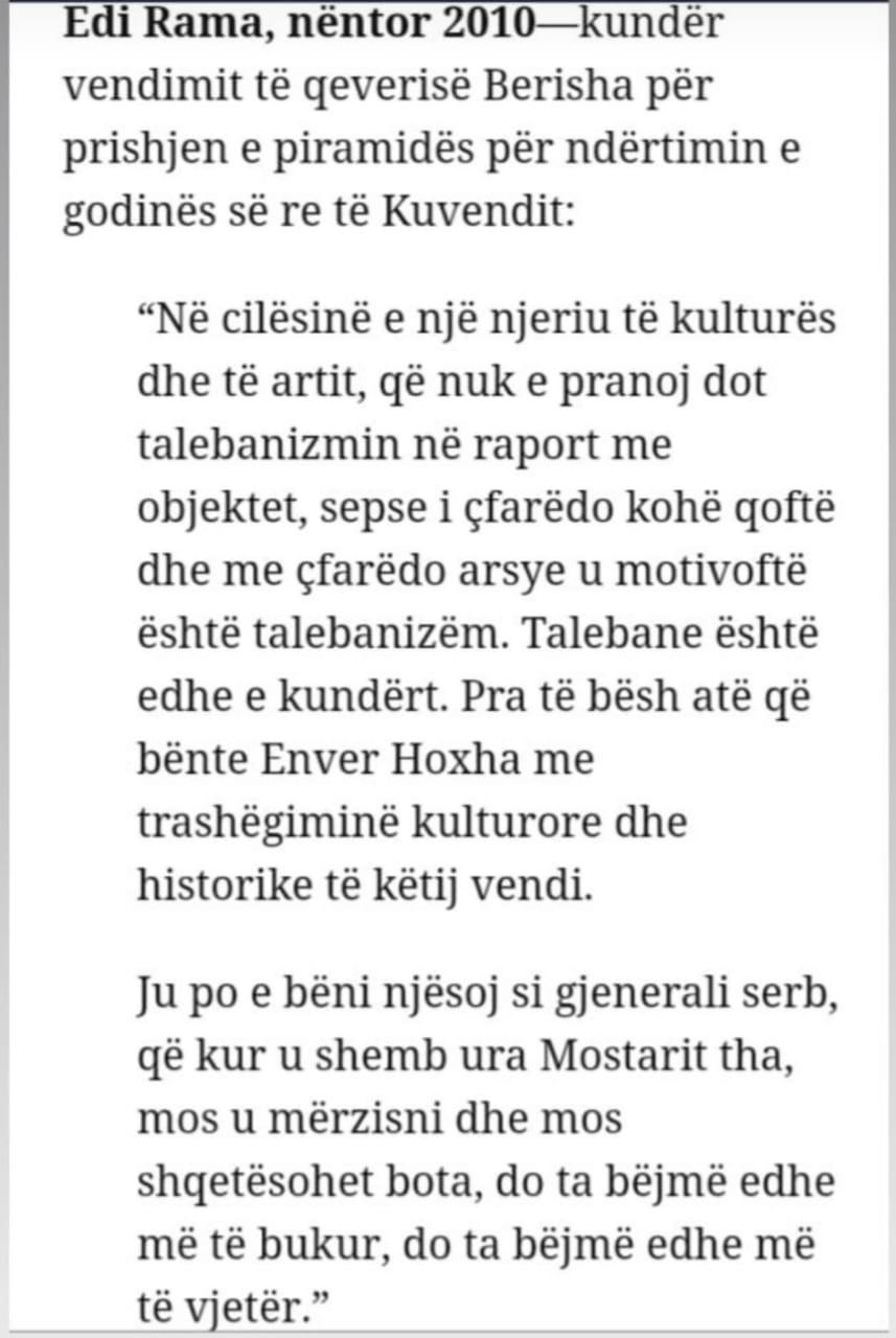 Edi Rama kur ka interes për pushtetin e tij dhe të oligarkëve prish dhe shkatërron, sikurse bëri këtë të dielë me dhunimin e shkatërrimin e Teatrit Kombëtar. Por po ky Edi Rama në vitin 2010 kur ishte në opozitë kundërshtoi kryeministrin e kohës, Berisha, për prishjen e Piramidës së Enverit. Bile e quajti objekt arti piramidën e ngritur për nder të diktatorit Hoxha.