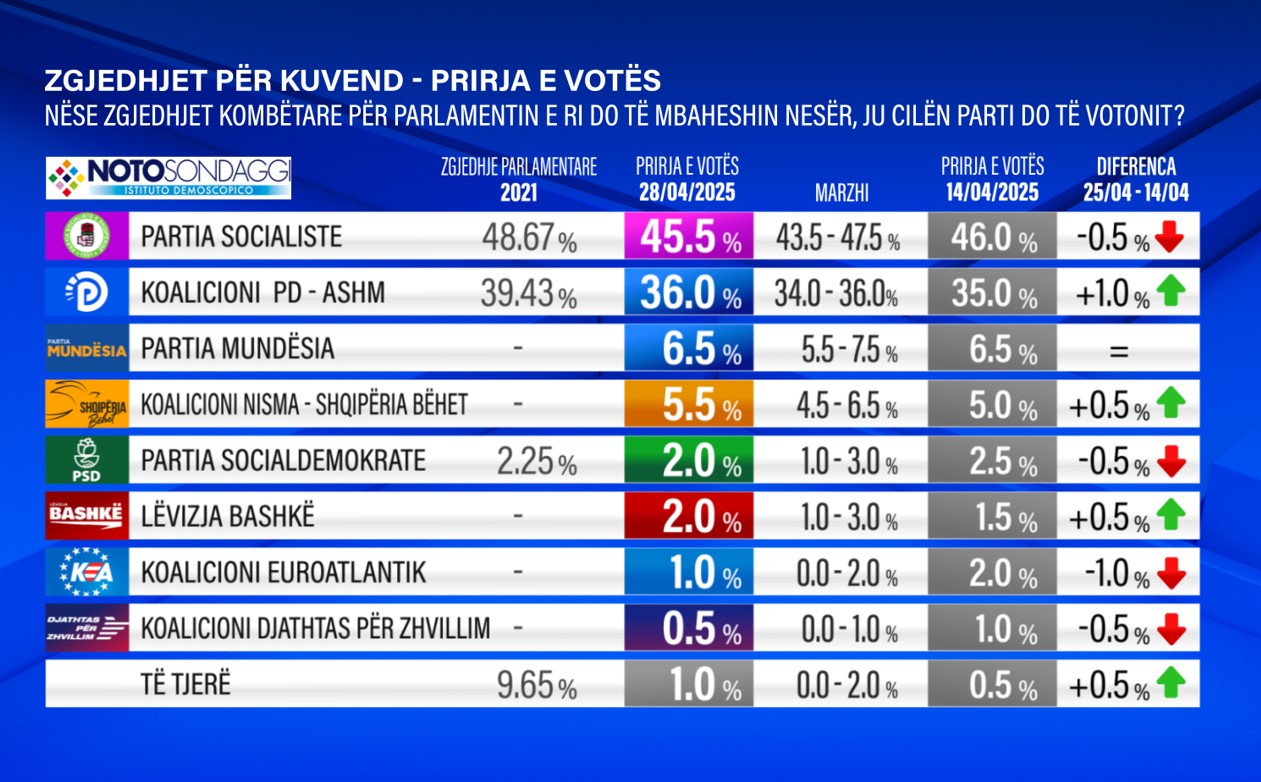 PSD zbret me 0.5%, ndërsa Lëvizja Bashkë rritet me 0.5% krahasuar me 14 prillin. Me 1% zbret koalicioni Euroatlantik i drejtuar nga ish-kryetari i PD, Lulzim Basha, ndërsa në rënie me 0.5% është edhe Djathtas për Zhvillim. Rriten me 0.5% ata që do të votonin një forcë tjetër politike.