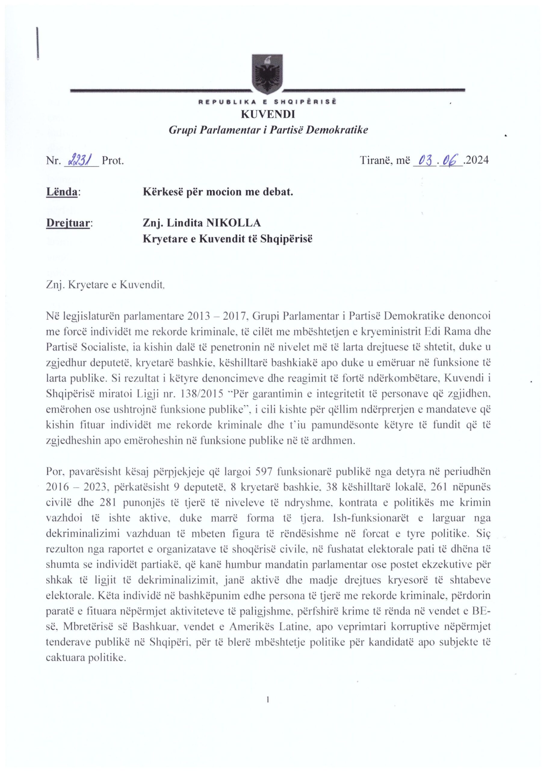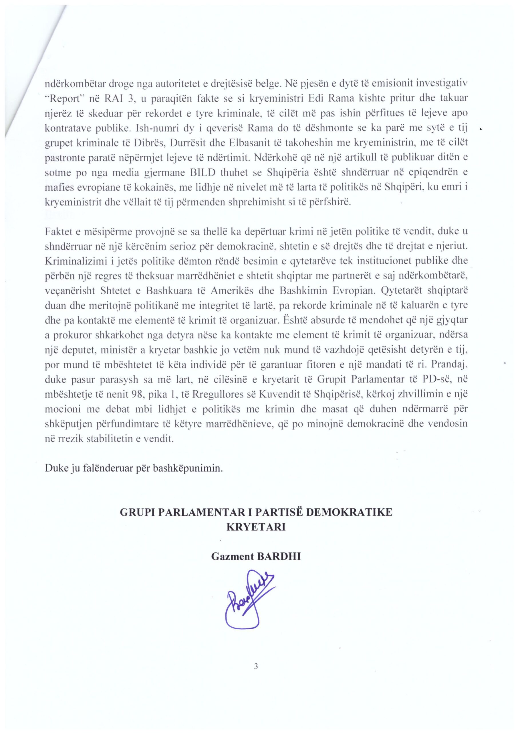 Grupi parlamentar i PD-së i drejtuar nga Gazment Bardhi ka depozituar kërkesën në Kuvend për një mocion me debat përsa i takon lidhjeve të politikës me krimin. Në emisionin investigativ Report në ”RAI3”, ku ndër të tjera ishte edhe një deklaratë e Arben Ahmetaj, i cili nga arratia akuzonte kryeministrin Edi Rama se kishte takuar në zyrën e tij përfaqësues të mafies.