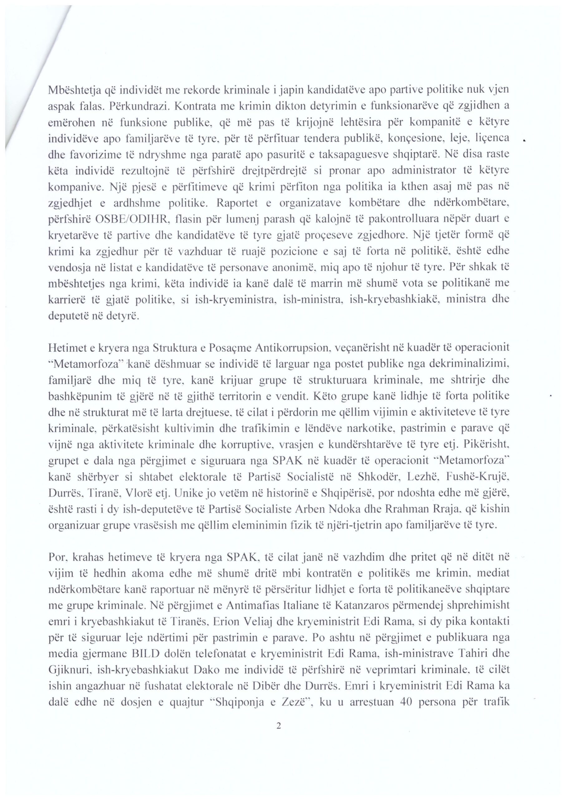 Raportet e organizatave kombëtare dhe ndërkombëtare, përfshirë OSBE/ODIHR, flasin për lumenj parash që kalojnë të pakontrolluara nëpër duart e kryetarëve të partive dhe kandidatëve të tyre gjatë proçeseve zgjedhore. Një tjetër formë që krimi ka zgjedhur për të vazhduar të ruajë pozicionet e tij të forta në politikë është edhe vendosja në listat e kandidatëve të personave anonimë, miq apo të njohur të tyre. Për shkak të mbështetjes nga krimi, këta individë ia kanë dalë të marrin më shumë vota se politikanë me karriere të gjatë politike, si ish-kryeministra, ish-ministra, ish-kryebashkiakë, ministra dhe deputetë në detyrë”, thuhet ndër të tjera në kërkesë.