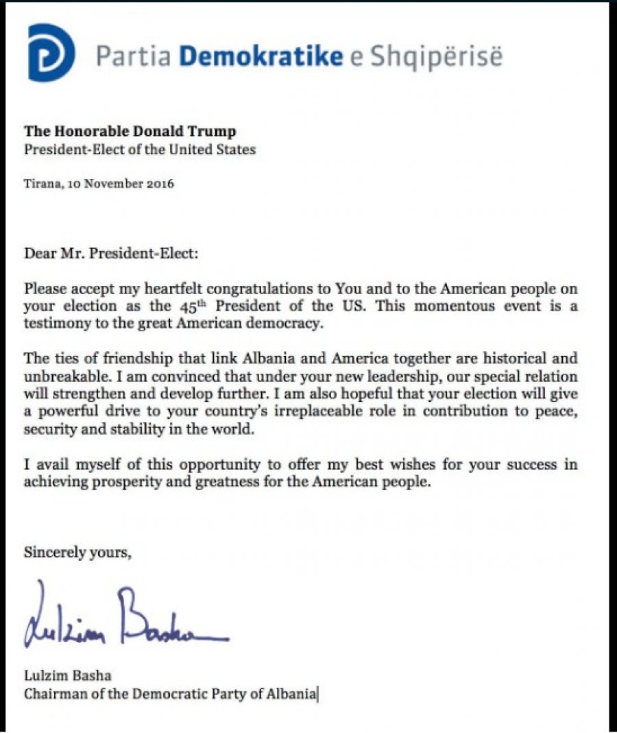 “Miqësia shqiptaro-amerikane është historike dhe e pathyeshme”, shkruan Basha në letrën e drejtuar presidenti të zgjedhur të SHBA-së, Donald Trump.