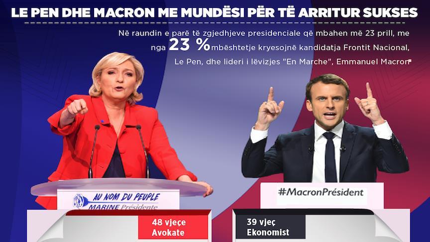 Në zgjedhjet presidenciale në Francë deri në këto momente e para është kandidatja kundër BE, Marine Le Pen. Deri tani janë numëruar 20 milionë vota dhe në vend të dytë Macron me 22 përqind të votave.