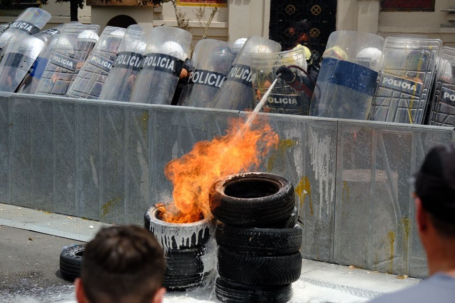 Protestuesit kanë shkulur edhe gardhin metalik, ndërsa kanë hedhur sende të forta drejt policisë. Efektivët janë përgjigjur me spraj lotësjellës.