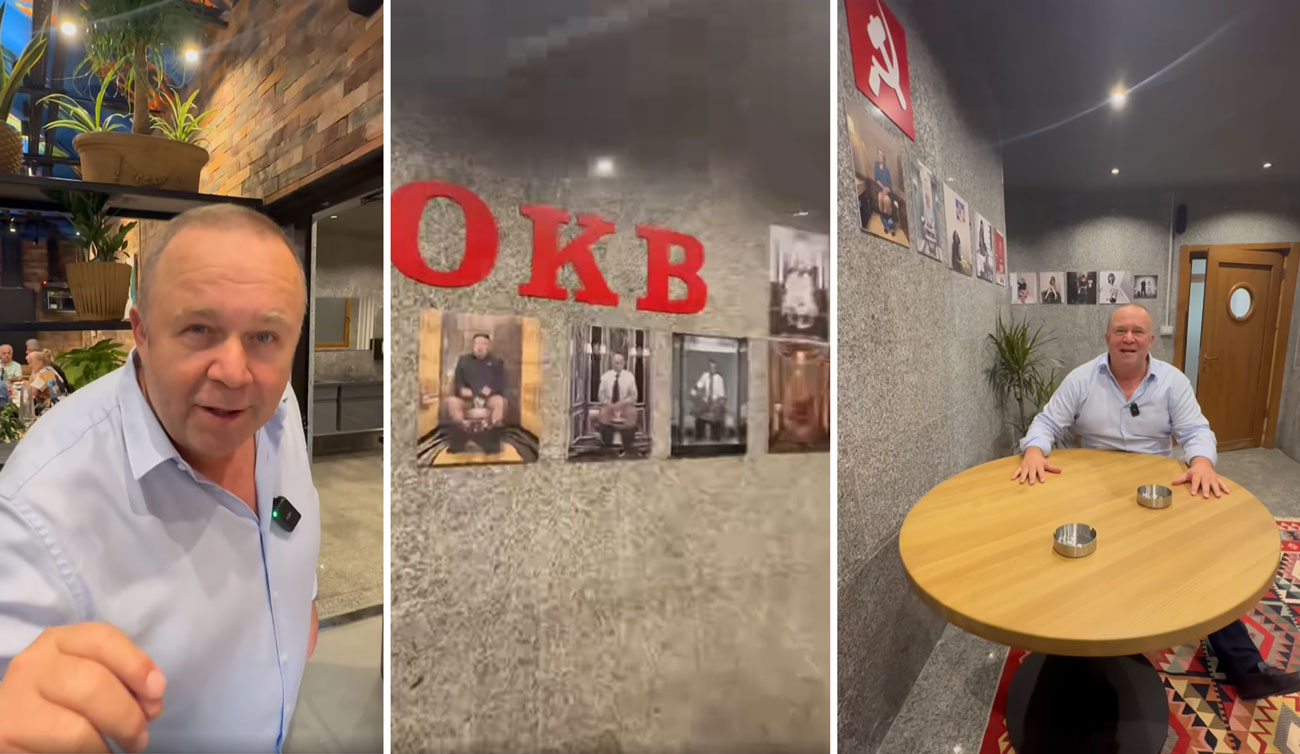 Në vijim të daljeve të tij publike në rrjetet sociale, në përpjekjen për të na e prezantuar të plotë “Trattoria Meloni”, ai na drejton për në nevojtore, në “OKB”, siç ai ironikisht e quan hodhin, që të çon në tualete, ku ai ka krijuar një kënd për duhan, një tavolinë e rrumbullakët mbi një qilim tradite, të cilin ai e quan “vendin ku merren vendime para se të merret avdes”.