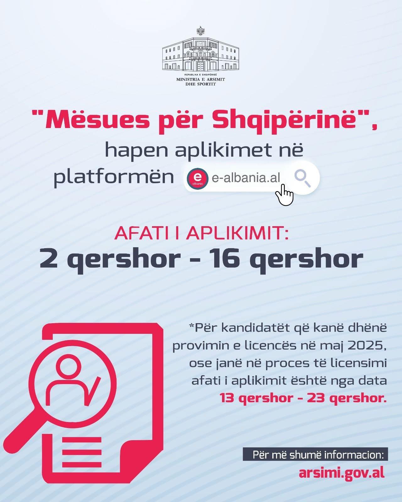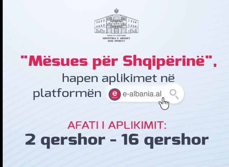 Më 2 qershor hapen aplikimet në platformën “Mësues për Shqipërinë” 2025. Lajmin e ka bërë të ditur kryeministri Edi Rama përmes një postimi në facebook, teksa thekson se aplikimet do zgjasin deri më 16 qershor.