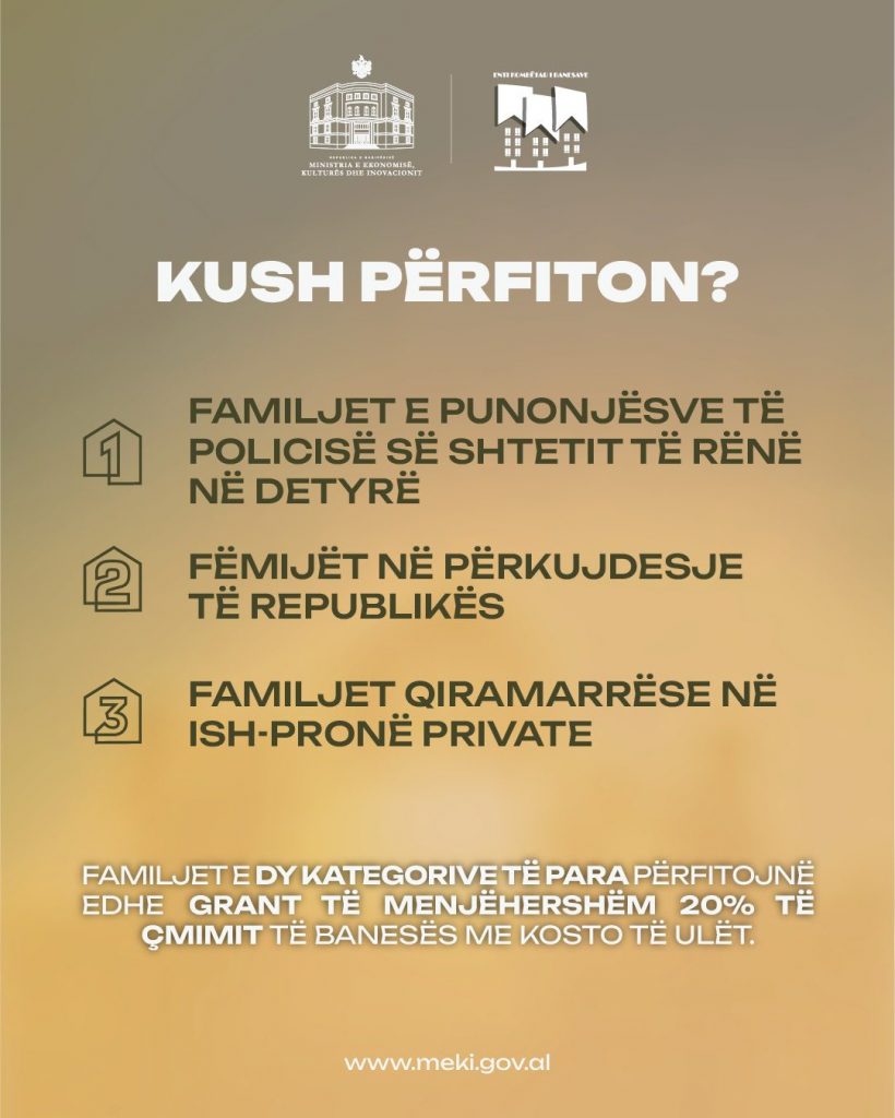 Ministri i Ekonomisë, Kulturës dhe Inovacionit, Blendi Gonxhja thotë se programi i mbështetjes përfshin disa kategori të rëndësishme të shoqërisë dhe një nga përfitimet e këtij programi është një grant i menjëhershëm prej 20% të çmimit të banesës, i cili do t’u ofrohet familjeve të punonjësve të rendit që kanë rënë në detyrë dhe fëmijëve në përkujdesje të Republikës, një nismë që synon të mbështesë ata në mënyrë të drejtpërdrejtë dhe të ndihmojë në lehtësimin e barrës financiare.