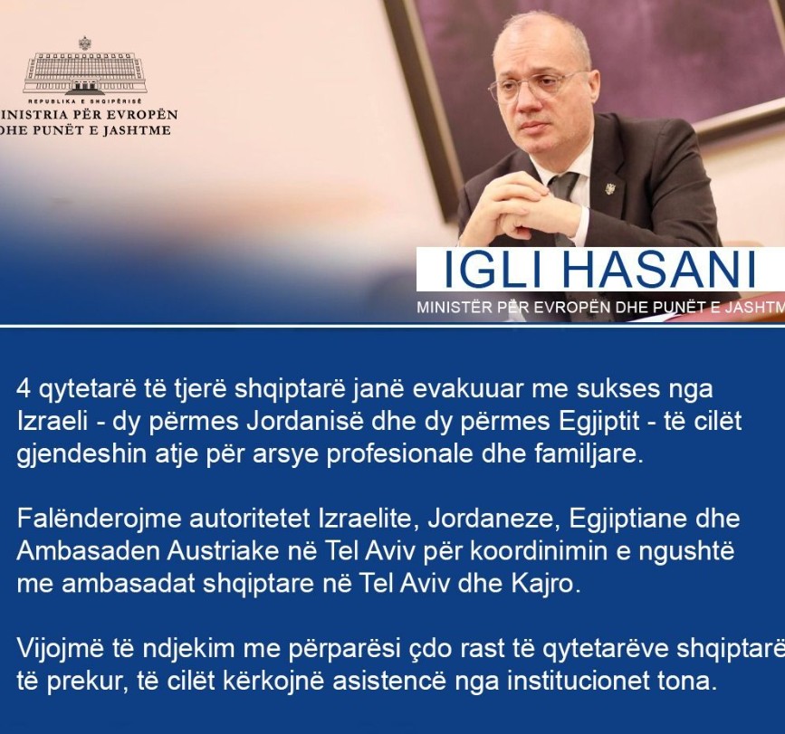 Ministri i Jashtëm Igli Hasani përmes një postimi në rrjete sociale bën me dije se 4 shtetas të tjerë shqiptarë janë evakuuar nga Izraeli. Shqiptarët gjendeshin atje për arsye profesionale dhe familjare, bën me dije ministri i Jashtëm.