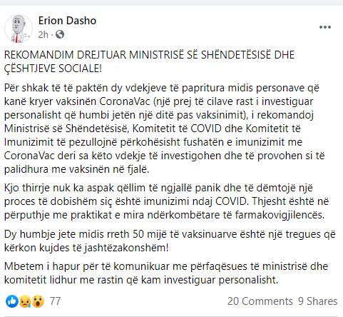 Dy humbje jete midis rreth 50 mijë të vaksinuarve është një tregues që kërkon kujdes të jashtëzakonshëm! Mbetem i hapur për të komunikuar me përfaqësues të ministrisë dhe komitetit lidhur me rastin që kam investiguar personalisht”- shkruan mjeku Erion Dasho në Facebook.