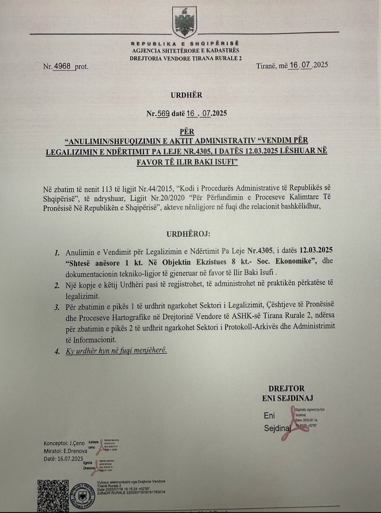 Me një vendim që mban datën e sotme, shtesa e legalizuar e këtij lokali në tokë publike, është anuluar nga Agjencia Shtetërore e Kadastrës. Legalizimi i këtij objekti ishte bërë më datë 12 Mars 2025.