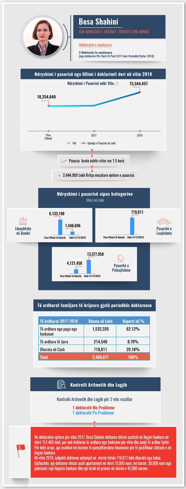 Skeda grafike e mëposhtme paraqet pasurinë e deklaruar nga ish-ministja e Arsimit, Sportit dhe Rinisë, Besa Shahini nga fillimi i detyrës publike në vitin 2017 deri në fund të vitit 2018.