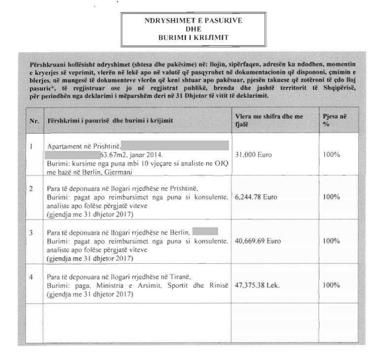 Në vitin 2018, Znj. Shahini deklaron blerjen e apartamentit me vlerë 75 mijë euro, për të cilën ka paguar vetëm 30 mijë euro me burim pakësimin e një depozite bankare, ndërsa pjesa tjetër prej 45 mijë eurosh do të sigurohej nga një kredi bankare në proces./ BIRN