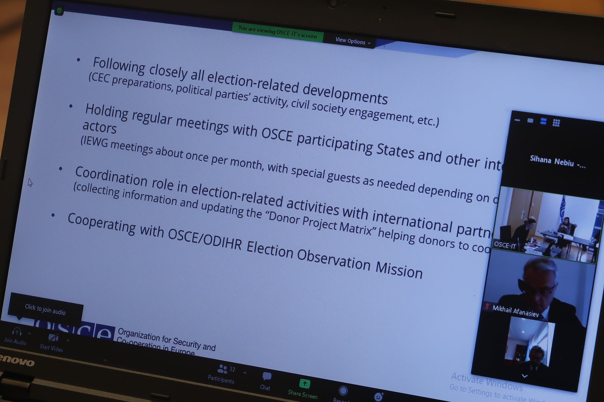 Prezenca i njohu përfaqësuesit e Shteteve pjesëmarrëse të OSBE-së dhe të organizatave ndërkombëtare me zhvillimet kryesore të reformës zgjedhore, si ndryshimet e Kushtetutës, Kodit Zgjedhor dhe ligjeve të tjera. Po ashtu, Prezenca i informoi ata lidhur me projektet në ndihmë të Komisionit Qendror të Zgjedhjeve (KQZ) dhe aktorëve të tjerë vendas, gjatë kohës së mbetur deri në zgjedhje.