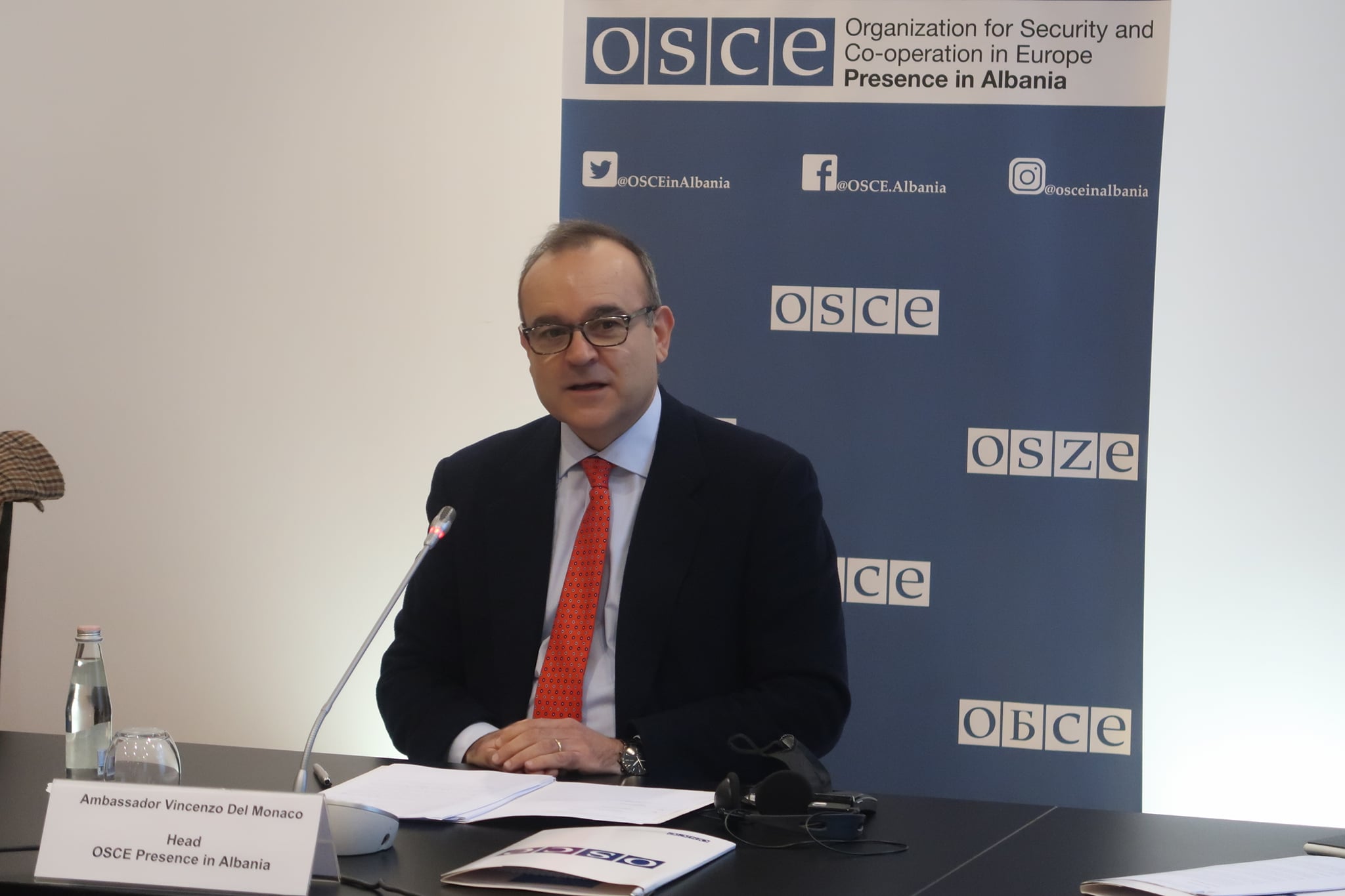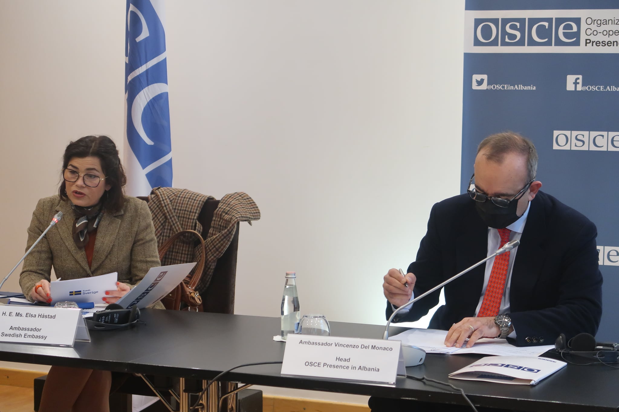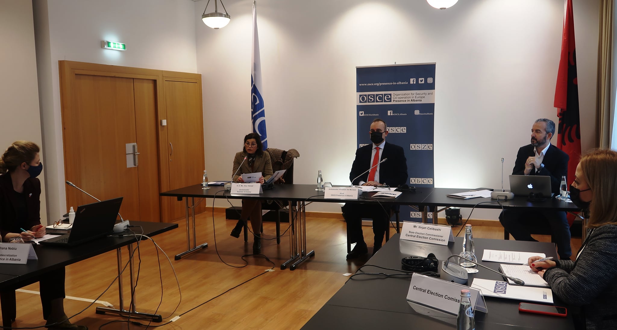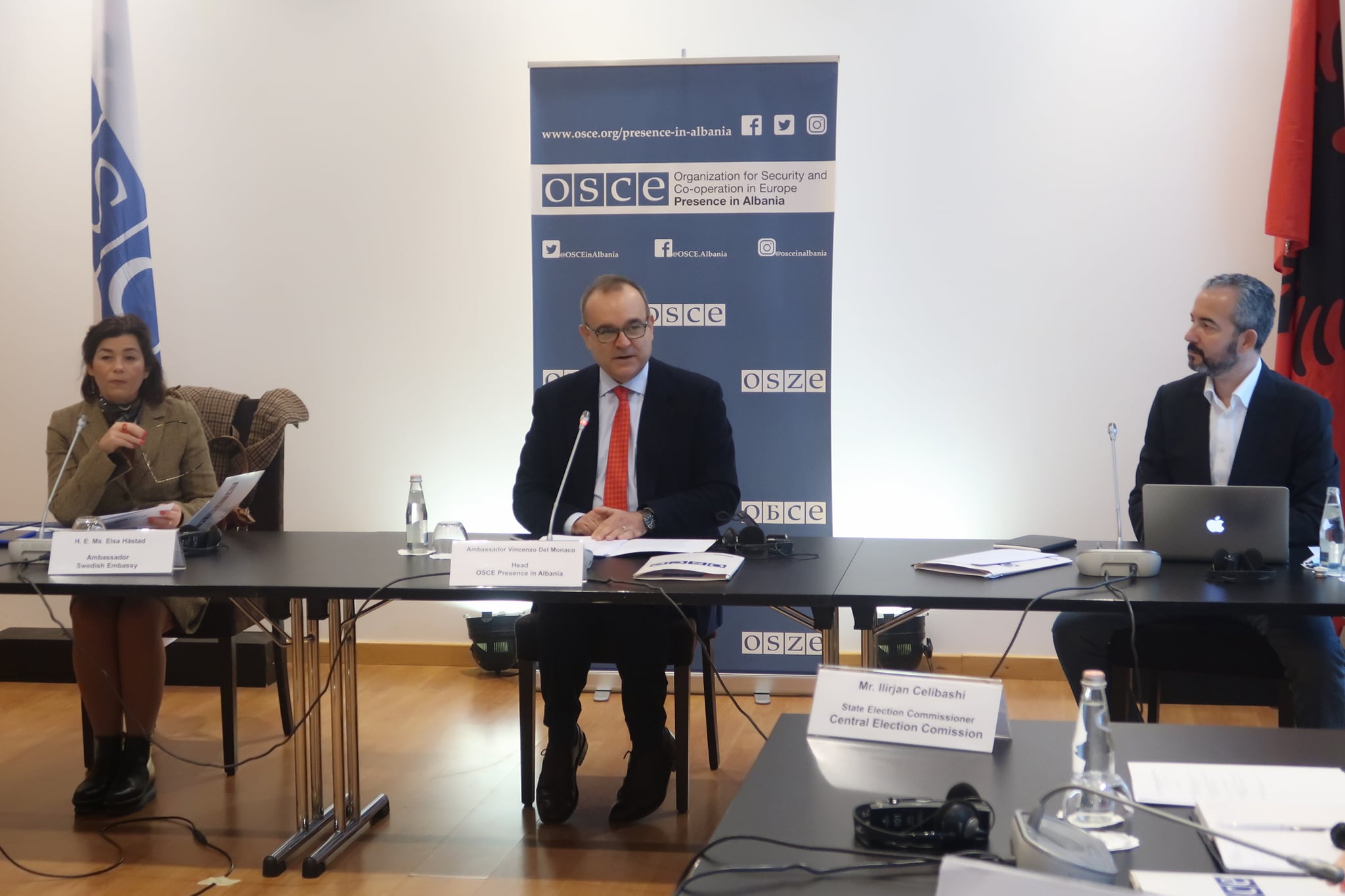 Thuajse tre muaj nga dita e zgjedhjeve, Kryetari i Prezencës së OSBE-së në Shqipëri, ambasadori Vincenzo Del Monaco, organizoi sot një takim të përfaqësuesve të bashkësisë ndërkombëtare në Shqipëri për të shkëmbyer informacion dhe për të bashkërenduar qëndrimet lidhur me zgjedhjet kuvendore të 25 prillit. Në krah të tij ishte ambasadorja suedeze, Elsa Håstad, vendi i së cilës mban Kryesinë e Radhës të OSBE-së.
