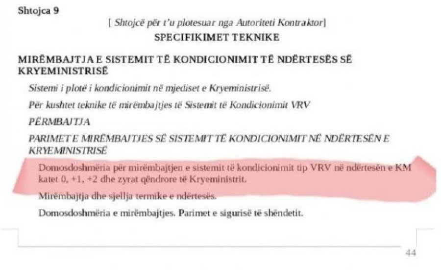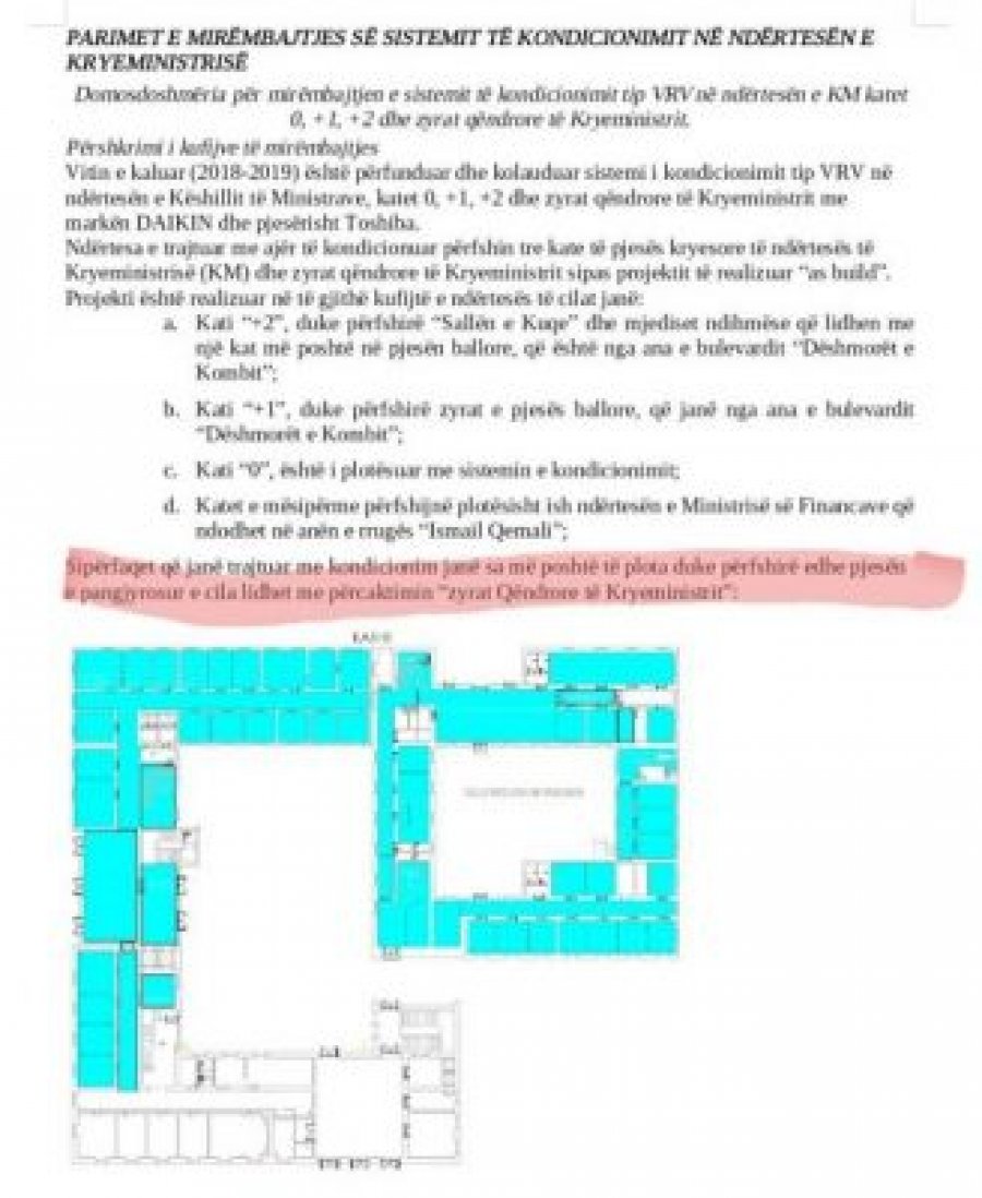 Duke shfletuar dokumentet e tenderit, ajo që bie në sy është se karkohet me ngulm që të mirëmbahet sistemi i kondicioninit në zyrat e kryeministrit. Rama ka kërkuar që t’i rregullohet sistemi i ngrohje ftohjes. Ja se çfarë shkruhet në dokumente; …domosdoshmëria për mirëmbajtjen e sistemit të kondicionimit tip VRV në ndërtesën e KM katet 0, +1, +2 dhe zyrat qëndrore të Kryeministrit. Ndërkohë, vijojnë se vitin e kaluar (2018-2019) është përfunduar dhe kolauduar sistemi i kondicionimit tip VRV në ndërtesën e Këshillit të Ministrave, katet 0, +1, +2 dhe zyrat qëndrore të Kryeministrit. Sipas dokumenteve, ndërtesa e trajtuar me ajër të kondicionuar përfshin tre kate të pjesës kryesore të ndërtesës të Kryeministrisë dhe zyrat qëndrore të Kryeministrit sipas projektit të realizuar “as build”. Projekti është realizuar në të gjithë kufijtë e ndërtesës të cilat janë: Kati “+2”, duke përfshirë “Sallën e Kuqe” dhe mjediset ndihmëse që lidhen me një kat më poshtë në pjesën ballore, që është nga ana e bulevardit “Dëshmorët e Kombit”; Kati “+1”, duke përfshirë zyrat e pjesës ballore, që janë nga ana e bulevardit “Dëshmorët e Kombit”; Kati “0”, është i plotësuar me sistemin e kondicionimit.
