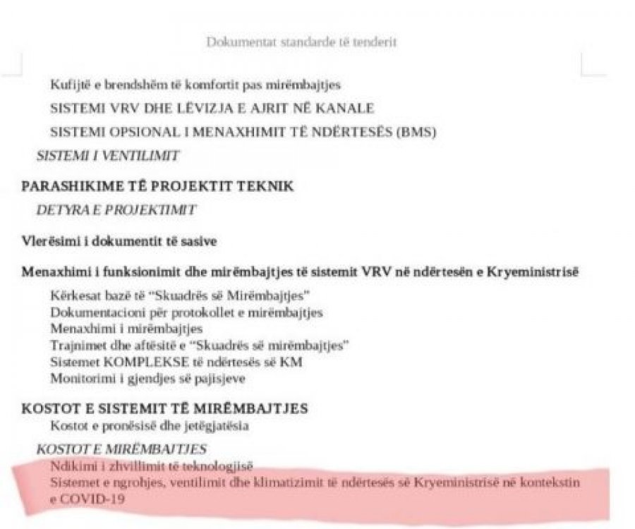 “Sipërfaqet që janë trajtuar me kondicionim janë sa më poshtë të plota duke përfshirë edhe pjesën e pangjyrosur e cila lidhet me përcaktimin ‘zyrat Qëndrore të Kryeministrit’” thuhet në dokumentet e këtij tenderi. Të cilat vijojnë me disa specifikime anti Covid. Sipas tyre, firma duhet të mirëmbajë sistemin teknik të kondicionimit, që përfshin, përveçse përmirësimin e performancës energjitike të projektuar dhe të zbatuar, por edhe vendosjen e kritereve dhe protokolleve teknike të cilat sigurojnë eficiencë të lartë, siguri shëndetësore (Covid-19), e cila klasifikohet si element thelbësor e lidhur ngushtë me mirëmbajtjen e ndërtesës historike./Boldnews/