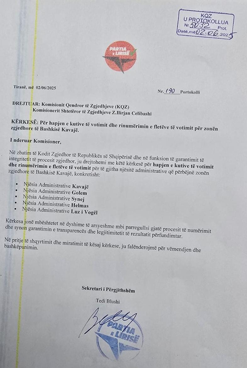 “Në zbatim të Kodit Zgjedhor të Republikës së Shqipërisë dhe në funksion të garantimit të integritetit të procesit zgjedhor, ju drejtohemi me këtë kërkesë për hapjen e kutive të votimit dhe rinumërimin e fletëve të votimit për të gjitha njësitë administrative që përbëjnë zonën zgjedhore të Bashkisë Kavajë, konkretisht: