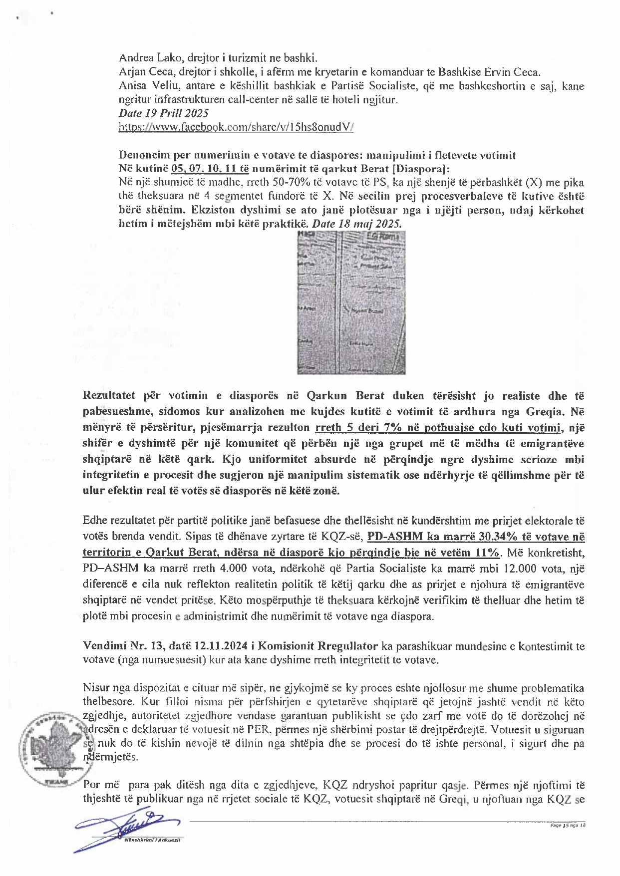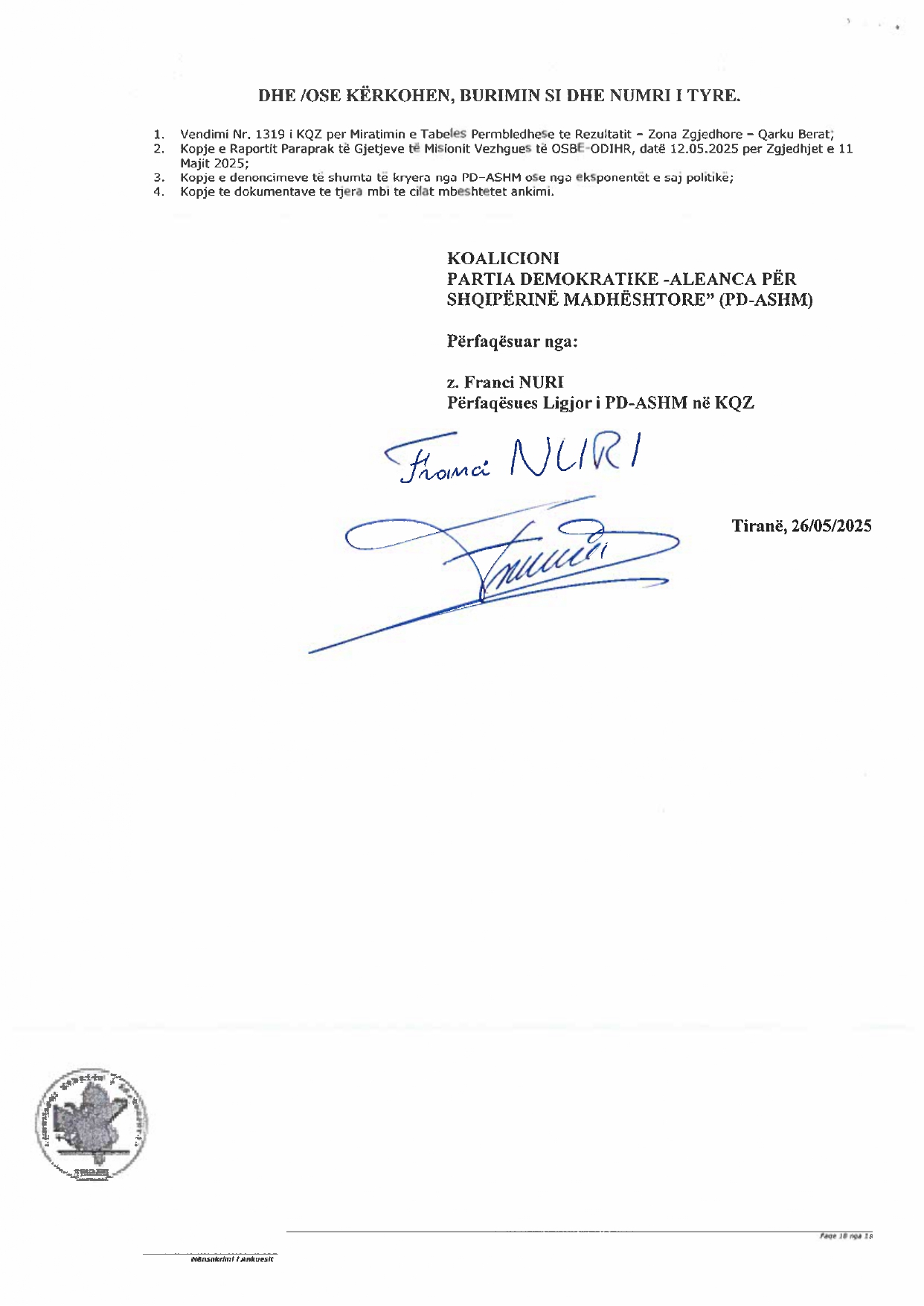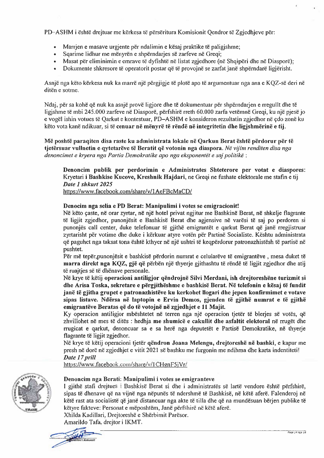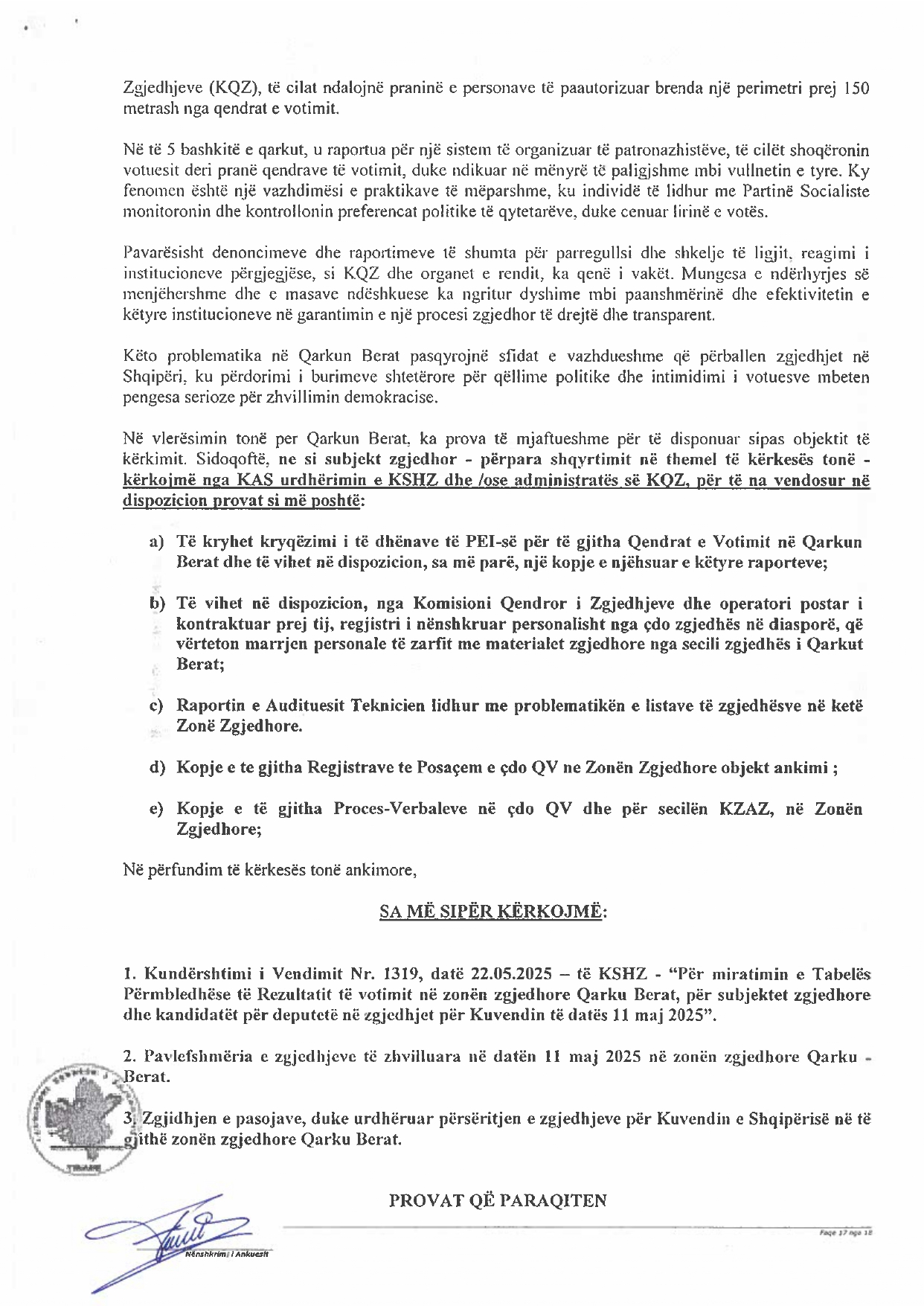 Selia blu pas betejës për të fituar mandatin e Ilir Alimehmetit, tashmë ka ankimuar edhe rezultatin e zgjedhjeve të 11 Majit për qarkun Berat. Në këtë qark, PD fitoi vetëm 2 mandate, kurse PS me 5 mandate. ”Në Berat, “makineria” e administratës nisi aksionin që në muajin janar, me fushatën për regjistrimin e diasporës, ku kontaktohej çdo person përfshirë edhe pensionistë që jetojnë në emigracion prej dekadash”,-thuhet në dokumentin e PD-së.
