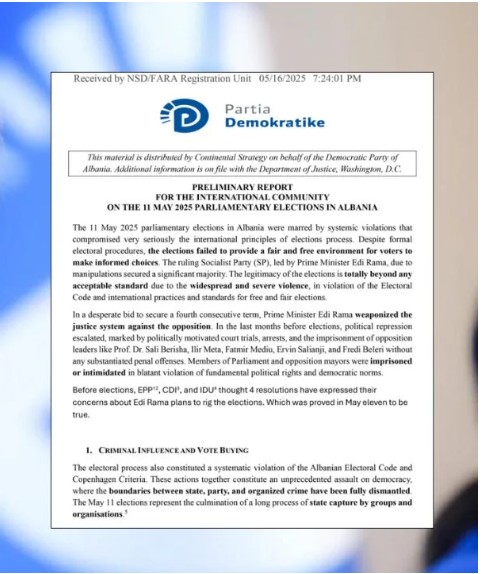 “Zgjedhjet parlamentare të 11 majit 2025 në Shqipëri u njollosën nga shkelje sistematike që cënuan shumë seriozisht parimet ndërkombëtare të procesit zgjedhor. Pavarësisht procedurave formale zgjedhore, zgjedhjet dështuan të ofrojnë një mjedis të drejtë dhe të lirë për votuesit që të bëjnë zgjedhje të informuara. Partia Socialiste (PS) në pushtet, e udhëhequr nga Kryeministri Edi Rama, përmes manipulimeve siguroi një shumicë të konsiderueshme. Legjitimiteti i këtyre zgjedhjeve është krejtësisht përtej çdo standardi të pranueshëm për shkak të dhunës së përhapur dhe të rëndë, në shkelje të Kodit Zgjedhor dhe praktikave e standardeve ndërkombëtare për zgjedhje të lira dhe të ndershme.