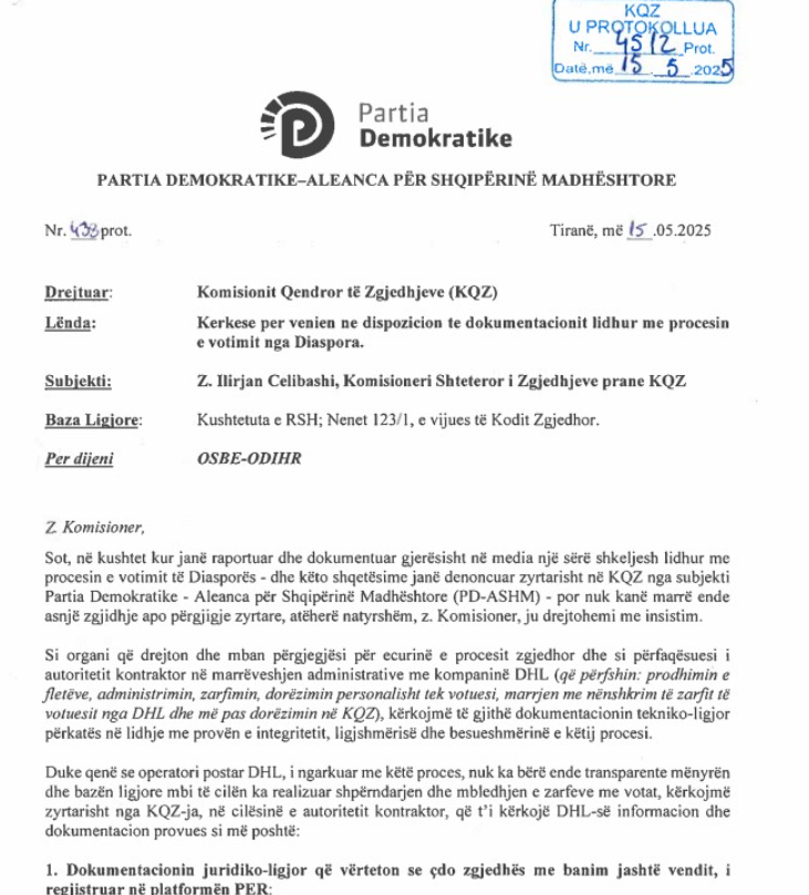 Partia Demokratike i kërkoi sot kryekomisionerit Ilirjan Celibashi që t’i kërkojë kompanisë postare të bëjë transparente mënyrën dhe bazën ligjore mbi të cilën ka realizuar shpërndarjen dhe mbledhjen e zarfave me vota në Greqi.