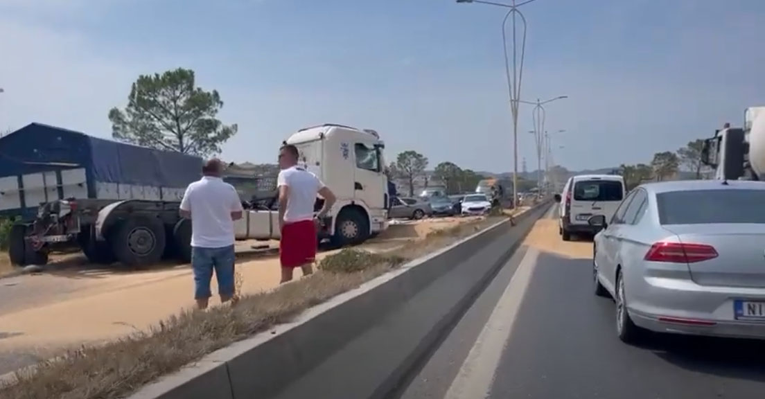 Përmbyset trajleri me grurë pranë mbikalimit të Rinasit, trafik kilometrik në autostradë (Pamjet)