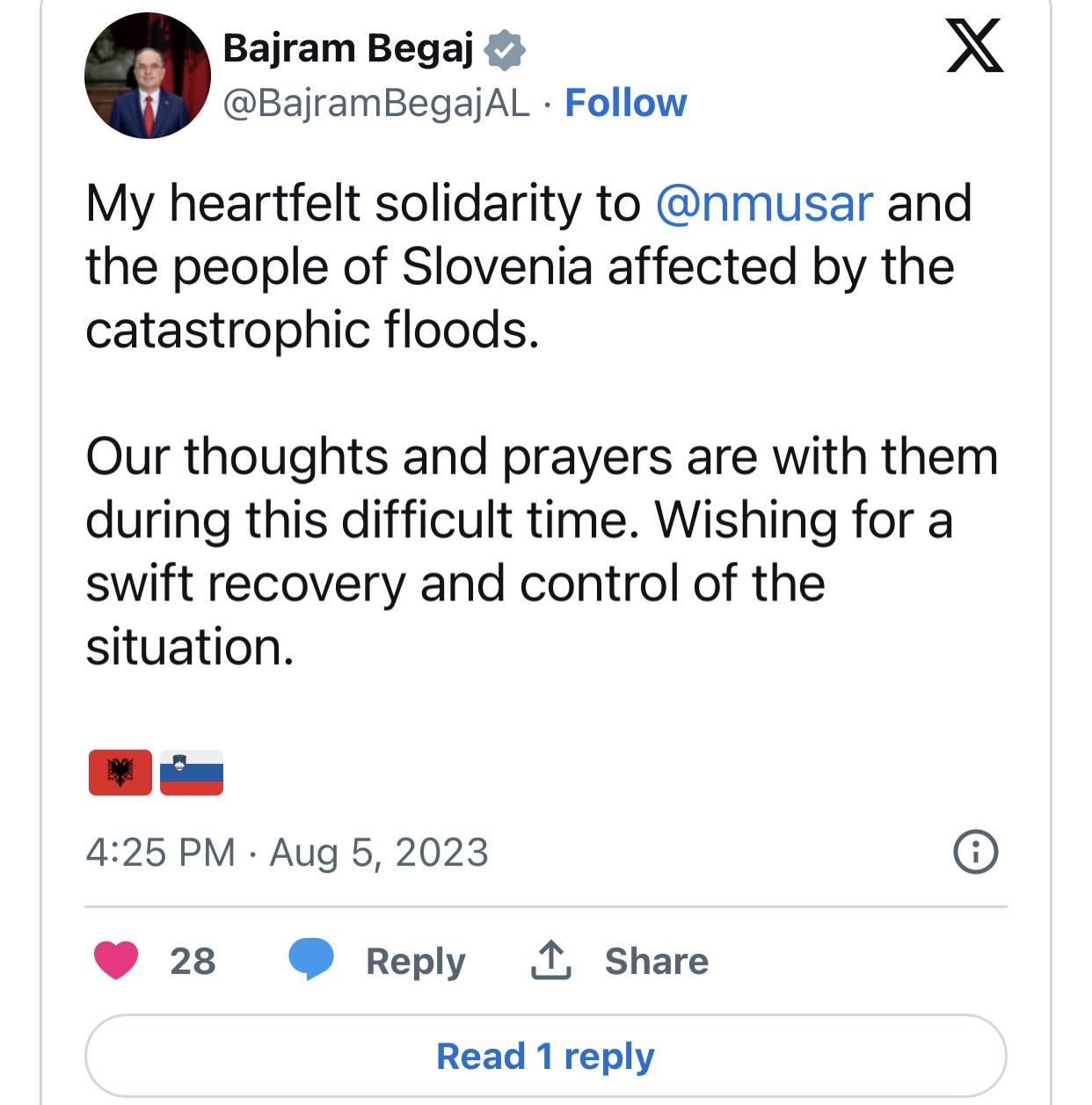 Me anë të një postimi në “Twitter”, Begaj është shprehur se në këtë kohë të vështirë lutjet janë më popullin e Sllovenisë dhe i uron rimëkëmbje të shpejtë.