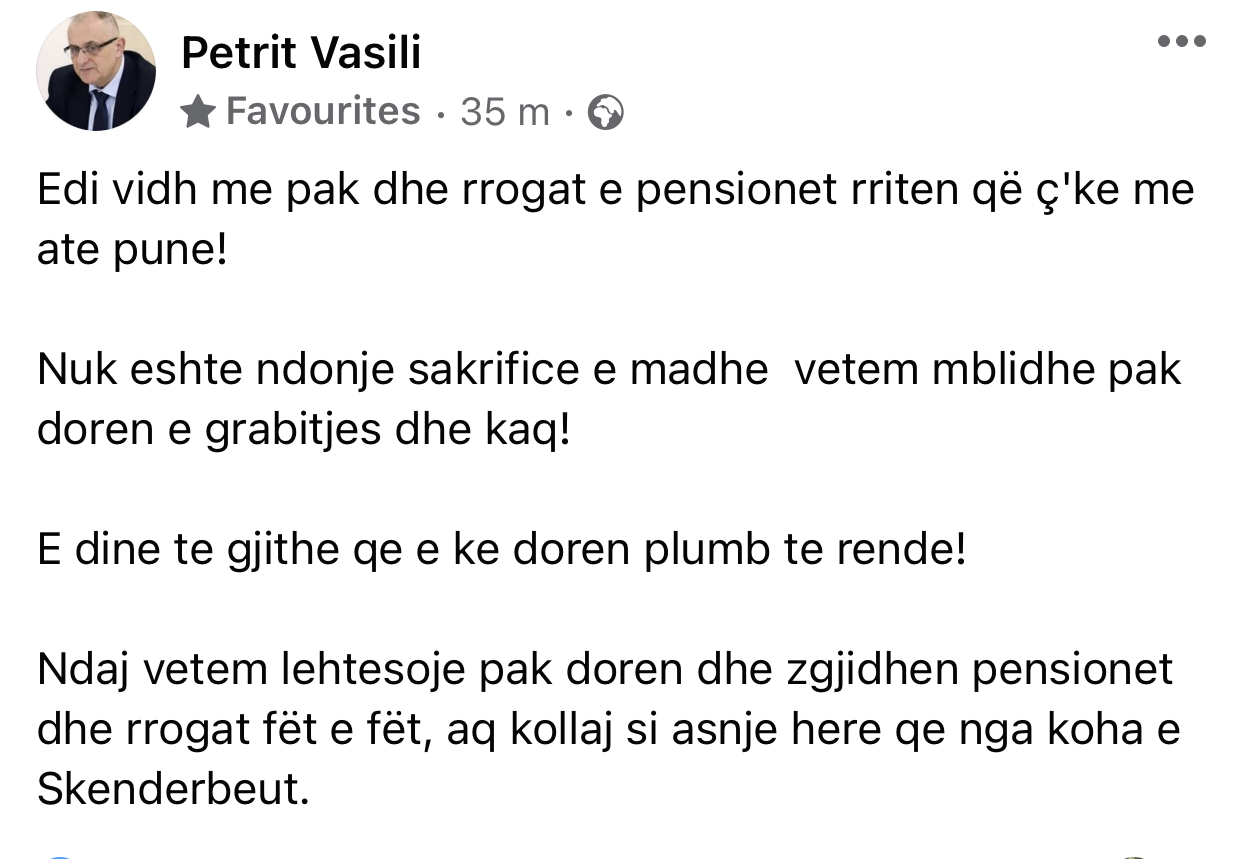 Me një postim në Facebook, Vasili shkruan se rrogat dhe pensionet rriten nëse kryeministri Edi Rama do të vidhte më pak.