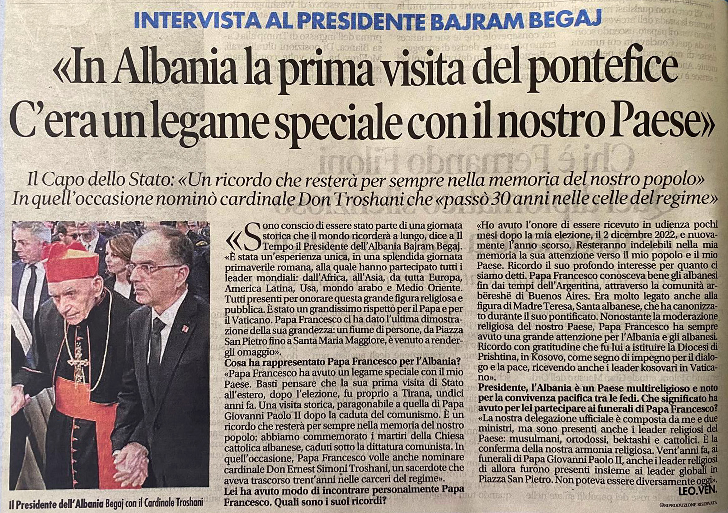 Në intervistë, Presidenti foli edhe për lidhjen e veçantë të Papa Françeskut me Shqipërinë, duke kujtuar se vizita e parë shtetërore jashtë Italisë pas zgjedhjes si Papë ishte pikërisht në Tiranë, njëmbëdhjetë vite më parë. “Një vizitë historike, e krahasueshme me atë të Papa Gjon Palit II pas rënies së komunizmit. Një kujtim që do të mbetet përherë në memorien e popullit tonë”, theksoi ai.