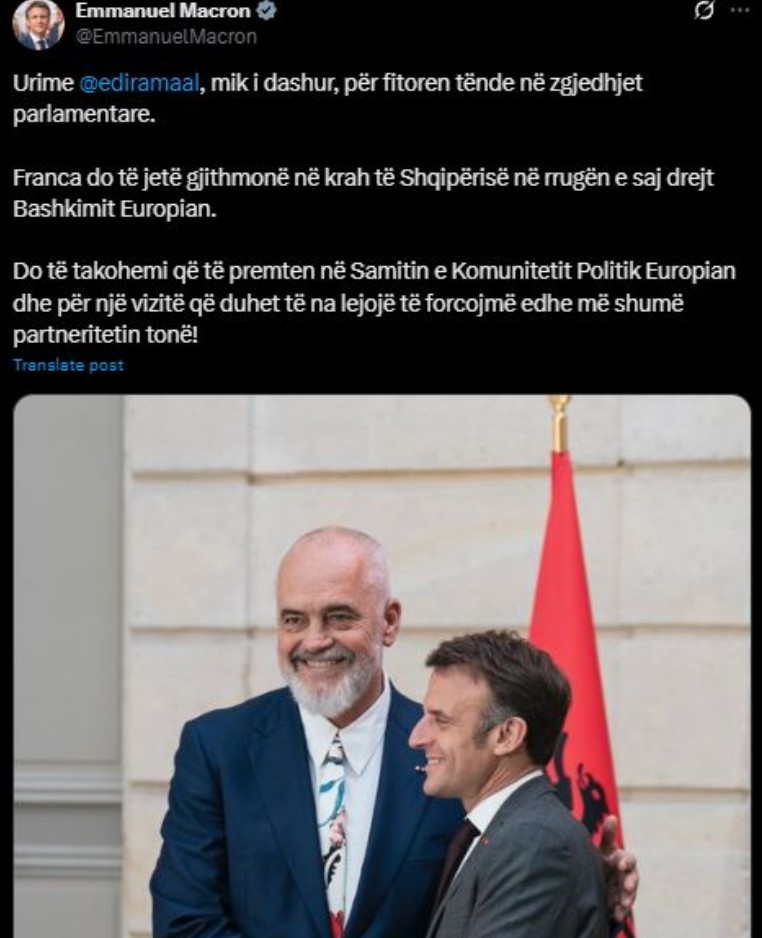 “Urime Edi Rama, mik i dashur, për fitoren tënde në zgjedhjet parlamentare. Franca do të jetë gjithmonë në krah të Shqipërisë në rrugën e saj drejt Bashkimit Europian. Do të takohemi që të premten në Samitin e Komunitetit Politik Europian dhe për një vizitë që duhet të na lejojë të forcojmë edhe më shumë partneritetin tonë!”.