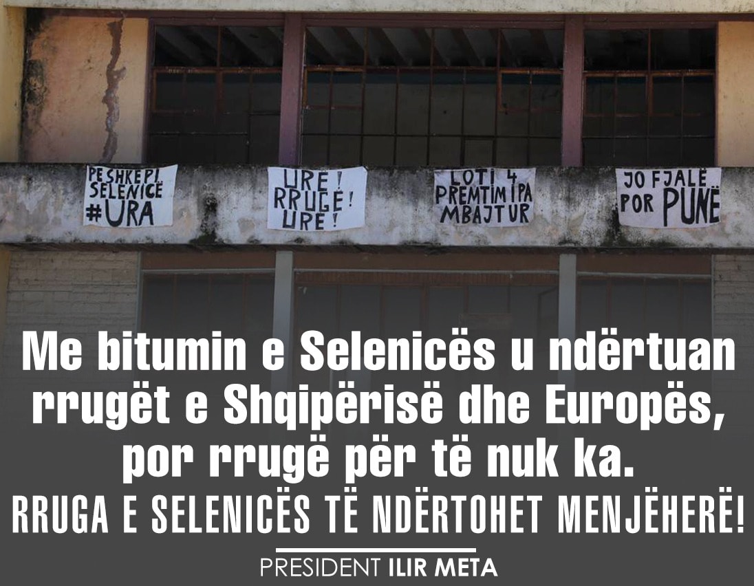“Me bitumin e Selenicës u ndërtuan rrugët e Shqipërisë dhe Europës, por rrugë për të nuk ka. RRUGA E SELENICËS TË NDËRTOHET MENJËHERË! 🇦🇱”, shkruan Presidenti Meta.