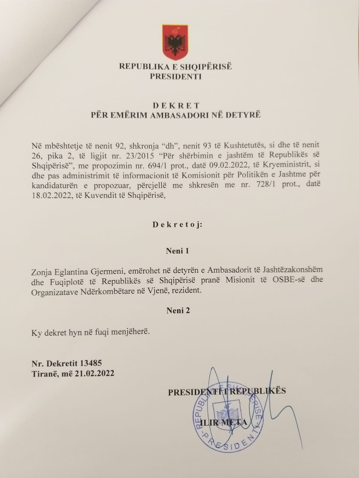 “Zonja Eglantina Gjermeni emërohet në detyrën e Ambasadorit të Jashtëzakonshëm dhe Fuqiplotë të Republikës së Shqipërisë pranë Misionit të OSBE-së dhe Organizatave Ndërkombëtare në Vjenë, rezident”, thuhet ne dekretin e Metes.