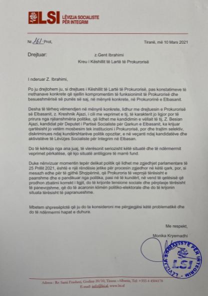 - A ka paraqitur opozita e vërtetë, kërkesë pranë Këshillit të Lartë të Prokurorisë, për të shmangur konfliktin e interesit mes Drejtuesit të Prokurorisë së Rrethit Elbasan dhe kandidatit për deputet të Partisë Socialiste dhe që mban datën 10 mars 2021?
