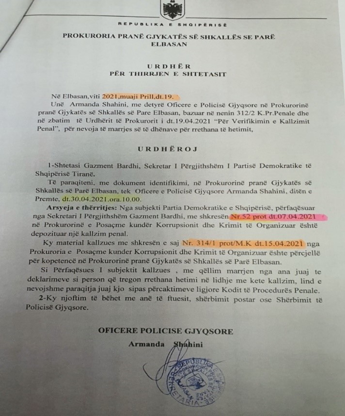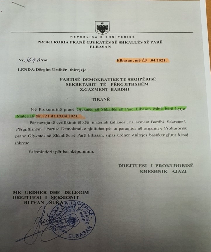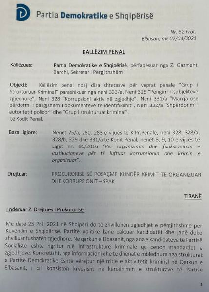 - Në datën 7 prill 2021, Partia Demokratike, përfaqësuar nga Sekretari i Përgjithshëm, Gazmend Bardhi me shkresë 52 prot, datë 07.04.2021, ka paraqitur në Prokurorinë e Posaçme Antikorrupsion dhe Kundër Krimit të Organizuar (SPAK) një Kallëzim Penal për hetimin e mbi 40 shtetasve të cilët në mënyrë të vazhduar ishin të angazhuar në favor të Partisë Socialiste, duke konsumuar në mënyrë të përditshme, në mes të Elbasanit, por jo vetëm, vepra penale të Krimit Zgjedhor, dhe vepra të tjera penale të lidhura me to. Ja ku e keni kopjen e kallëzimit penal”, shkruan Meta.