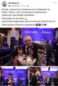 “Shumë i nderuar të vlerësohem sot në Shkodër me titullin “Njeriu i vitit” në aktivitetin tradicional të organizuar nga familjet shkodrane. Mirënjohje me përulësi! Faleminderit legjendave Ismet Hoxha dhe Selami Dani të Vllaznisë për simbolet e kuqebluve.”, shkruan presidenti në Facebook.