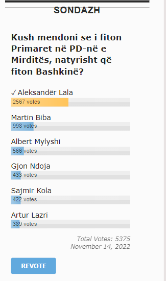 Mes emrave Aleksandër Lala, Martin Biba, Albert Mylyshi, Gjon Ndoja, Sajmir Kola dhe Artur Lazri deri tani në sondazhin online, që po vazhdon, e kryeson bindshëm Aleksandër Lala.