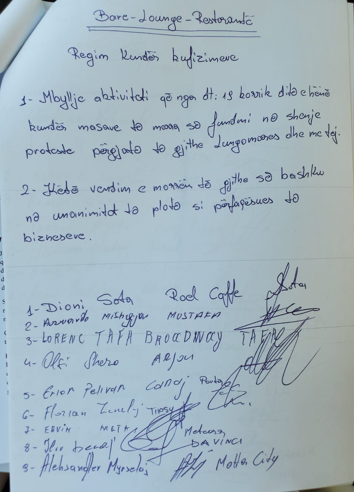 1. Ju lutemi shfuqizoni aktin normativ Nr.3. dt. 15/03/2020 që na kufizon të drejtën tonë kushtetuese për të ushtruar të lirë aktivitetin tonë jetik. Ky akt normativ me kufizimet e tij duke mos reflektuar paralelisht me ulje taksash apo subvencione po na falimenton.