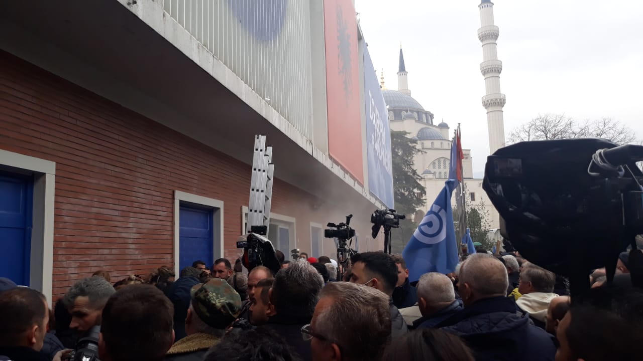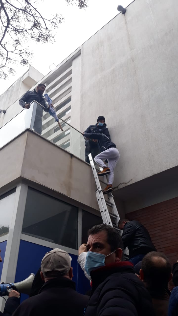 Ndërkohë mediat raportojnë se po hidhen gurë e sende të forta për të zmbrapsur protestuesit. Disa protestues janë dëmtuar dhe janë tërhequr nga kati i dytë.
