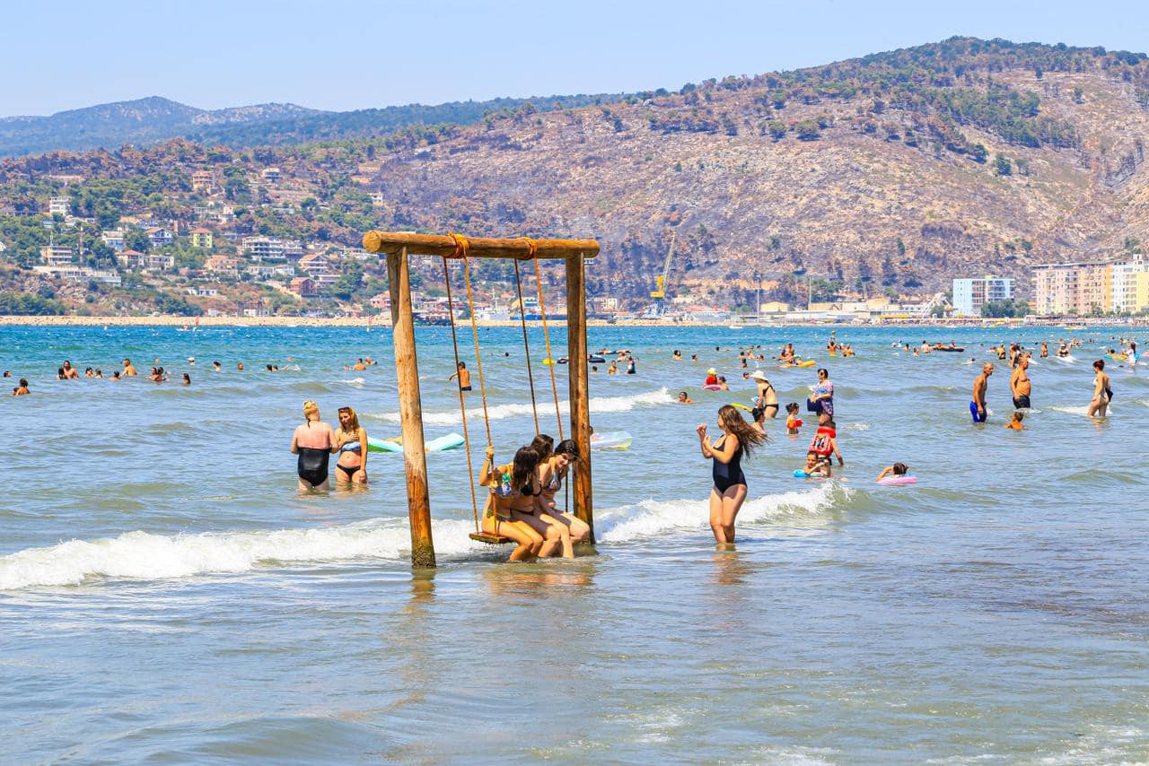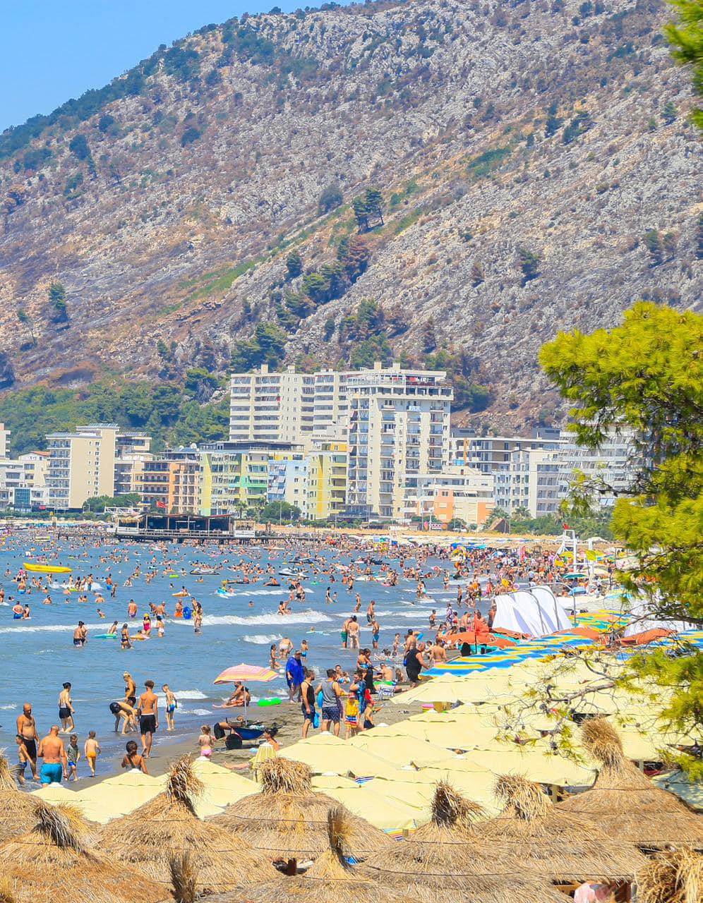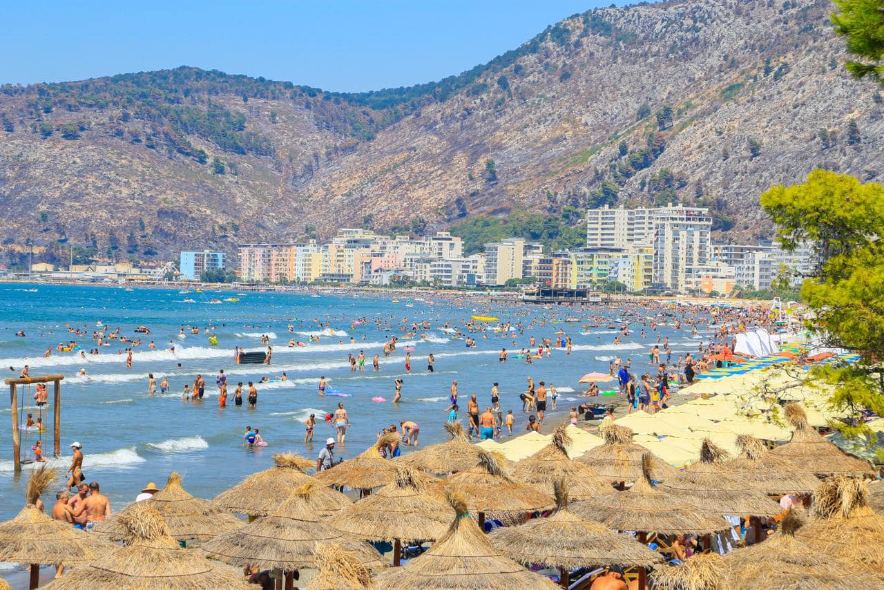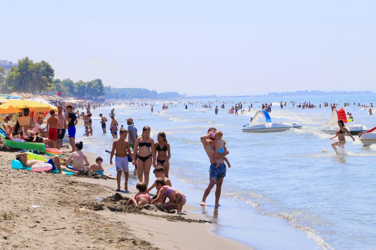 Rama poston fotot nga plazhi i Kunës në Shëngjin, shihet i tejmbushur me turistë dhe pushues