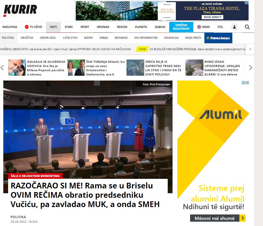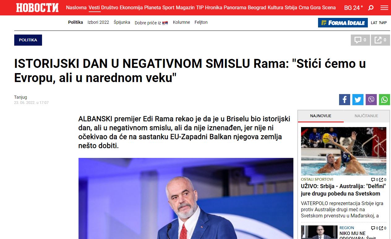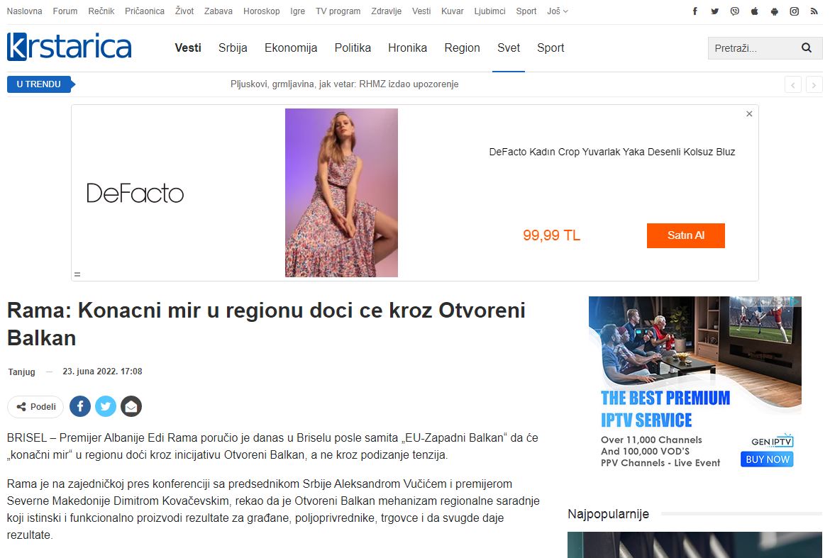 Kurse në Serbi, media ”Blic” e ka interpretuar fjalën e Ramës duke e ndërlidhur me ”Ballkanin e Hapur”. Në artikull shkruhet edhe se Rama kë folur për bashkimin e Kosovës në ”Ballkanin e Hapur”, ndërkohë që gjithashtu ai ka deklaruar se Ukraina nuk duhet të ketë shumë iluzione në lidhje me hapjen e negociatave me BE-në.