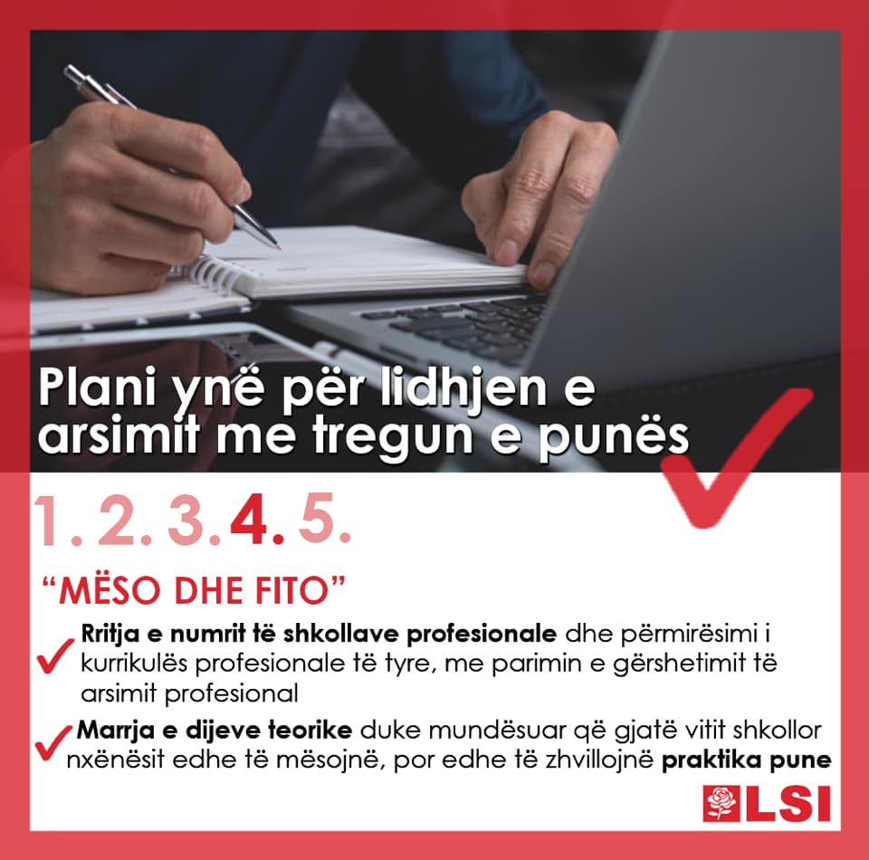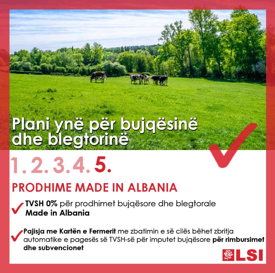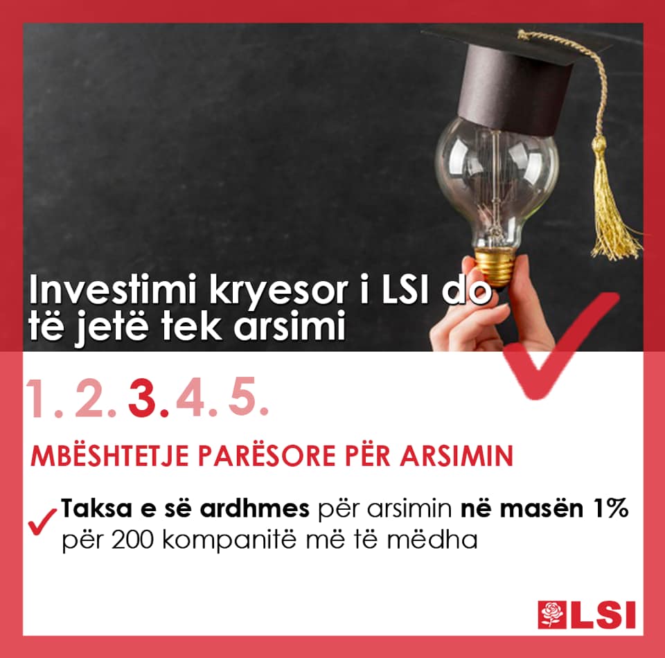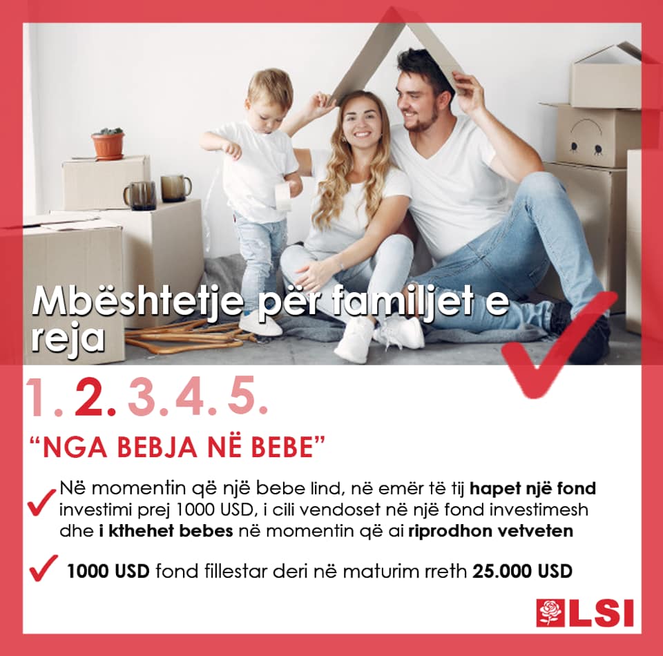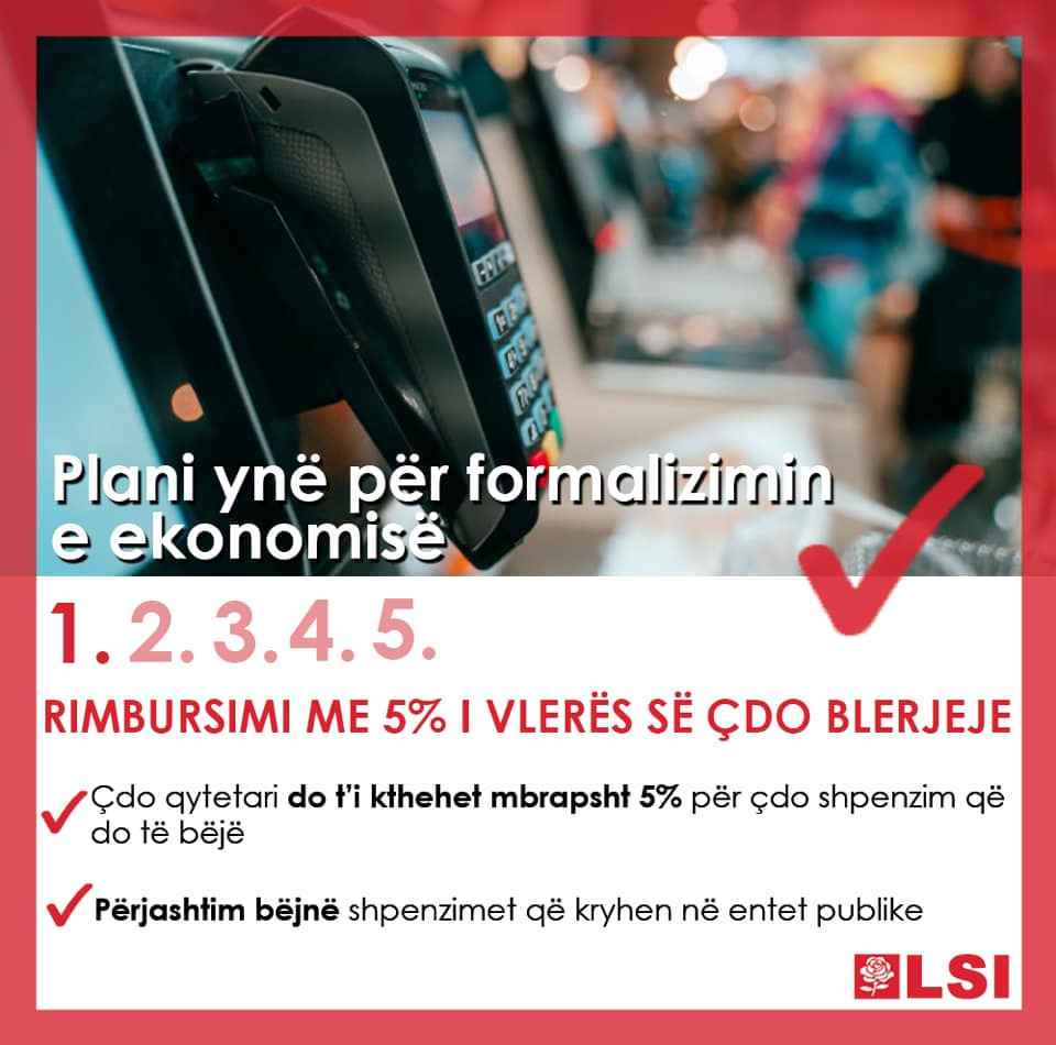 Sekretari i LSI në Tiranë, Klevi Pojana, ka treguar edhe njëherë tjetër se cilat janë 5 prioritetet programit të LSI-së. ‘‘Rimbursim me 5% të vlerës së çdo blerje, fond investimi 1 mijë dollarë për çdo bebe që lind, TVSH 0% për prodhimet bujqësore dhe blegtorale Made in Albania, 1% Taksa e të Ardhmes për arsimin për 200 kompanitë më të mëdha dhe investim në arsimin profesional”,- shprehet Pojana në një postim në Facebook.