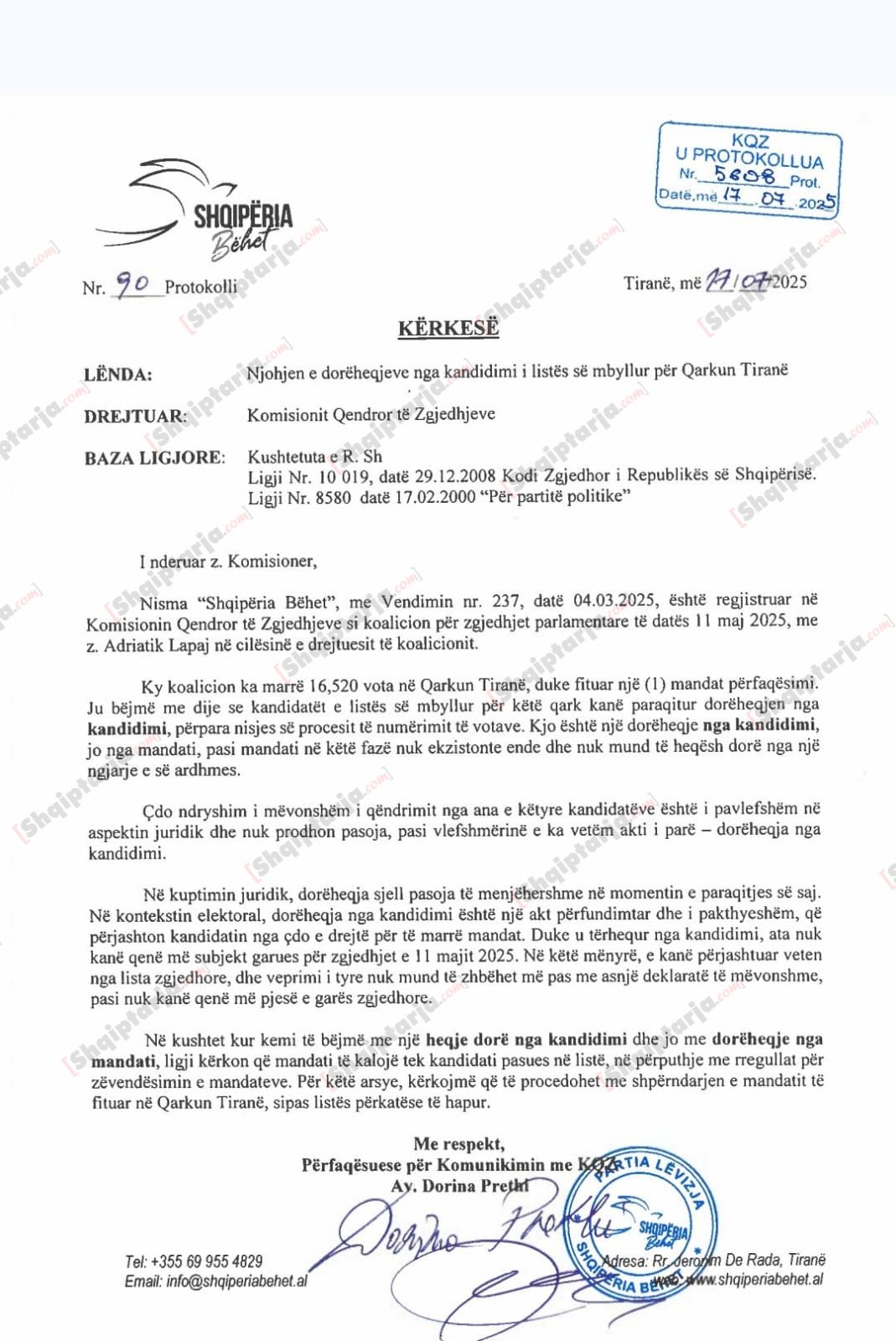”Në kontekstin elektoral, dorëheqja nga kandidimi është një akt përfundimtar dhe i pakthyeshëm, që përjashton kandidatin nga çdo e drejtë për të marrë mandat. Duke u tërhequr nga kandidimi, ata nuk kanë qenë më subjekt garues për zgjedhjet e 11 majit 2025”,-theksohet në letrën e “Shqipëria Bëhet”.