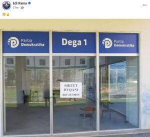 Kryeministri Edi Rama ka ironizuar ditën e sotme Partinë Demokratike në prag të zgjedhjeve për Bashkinë e Tiranës. Kreu i qeverisë ka publikuar në rrjete sociale foton e një ambienti ku më herët ka qenë Dega 1 e PD-së, por tashmë është në shitje dhe jo në funksion të demokratëve.