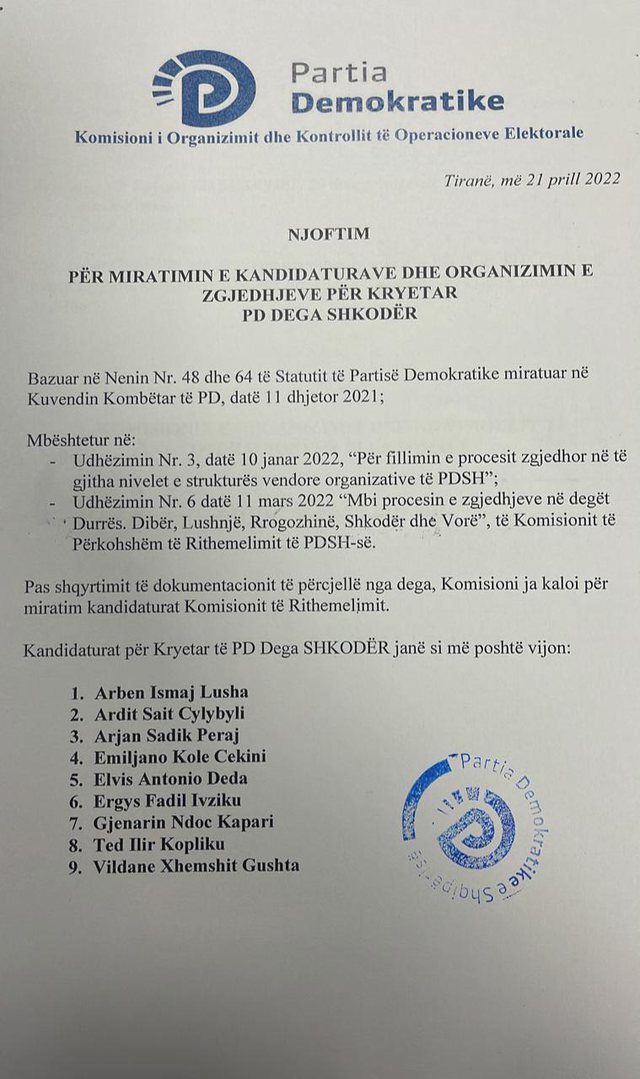 Nesër demokratët e Shkodrës do votojnë kryetarin e ri të degës. Komisioni i Rithemelimit ka zyrtarizuar 8 emra në garë, mes tyre edhe nënkryetari i bashkisë, Ardit Qylybyli. Nga gara ka deklaruar dorëheqjen i riu, Tedi Kopliku.
