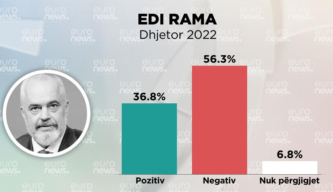 56.3% e shqiptarëve kanë mendim negativ për kryeministrin Edi Rama. Ndërsa 36.8% kanë mendim pozitiv dhe 6.8% nuk përgjigjen.