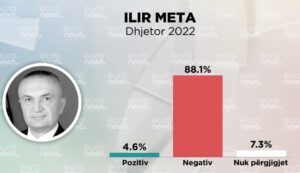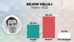 Për kryetarin e bashkisë Tiranë Erion Veliajn 53.4% e kanë mendim negativ, 33.3% kanë mendim pozitiv dhe 13.3% kanë zgjedhur të mos përgjigjen.