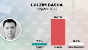 84.1% e shqiptarëve kanë mendim negativ për ish-kreun e PD-së Lulzim Basha. Vetëm 7.6% e shqiptarëve kanë mendim pozitiv dhe 8.3% nuk janë përgjigjur./Euronewsalbania/