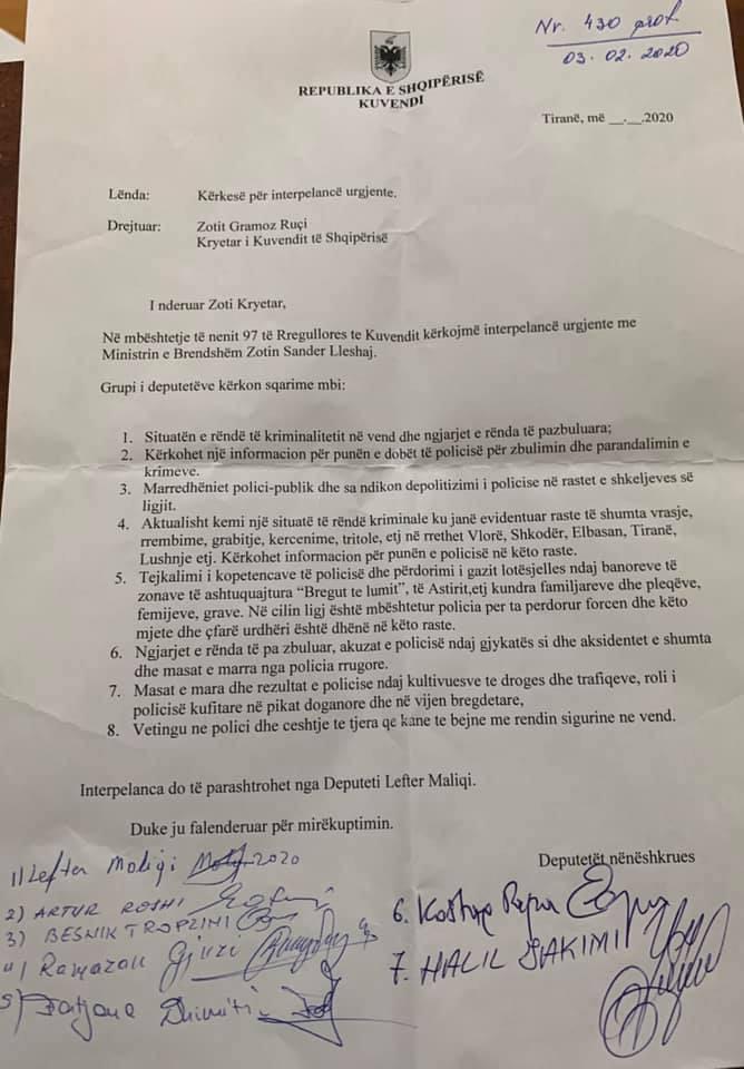 Kërkesa e firmosur nga deputetët Lefter Maliqi, Artur Roshi, etj, ka si objekt dhënien e sqarimeve nga Ministria e Brendshme për luftën ndaj krimit.