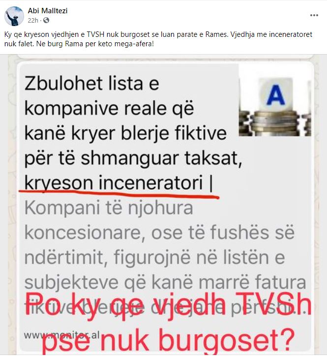 “Ky që kryeson vjedhjen e TVSH nuk burgoset se luan paratë e Ramës. Vjedhja me inceneratorët nuk falet. Në burg Rama për këto mega-afera!”,– shkruan Malltezi në një postim në Facebook.