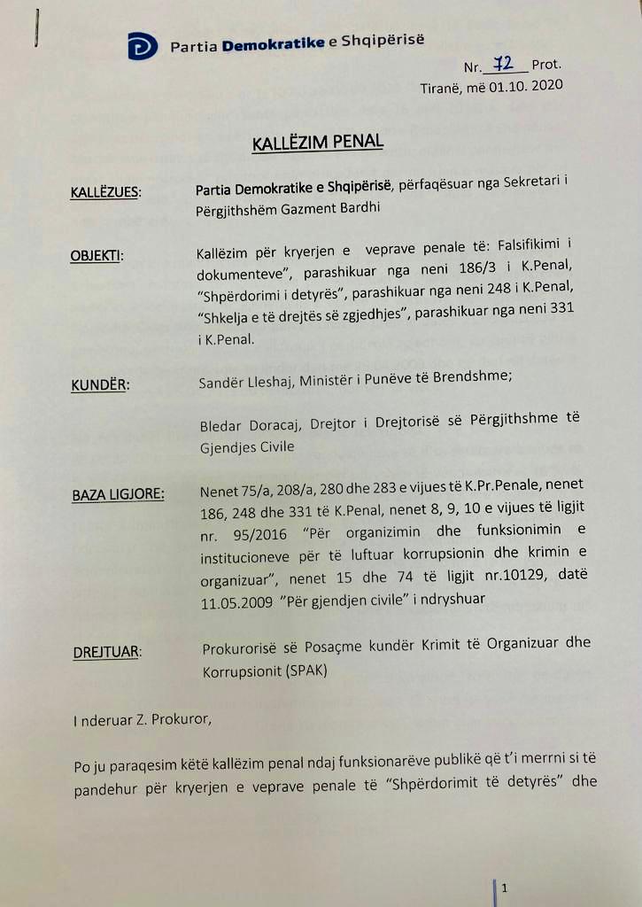 Ministrin e Brendshëm Sandër Lleshaj dhe Drejtorin e Përgjithshëm të Gjendjes Civile Bledar Doracaj, për të cilët dorëzoi kallëzim penal në SPAK për 3 vepra penale: fallsifikim i dokumenteve, shpërdorim i detyrës dhe shkelje e të drejtës së zgjedhjes.